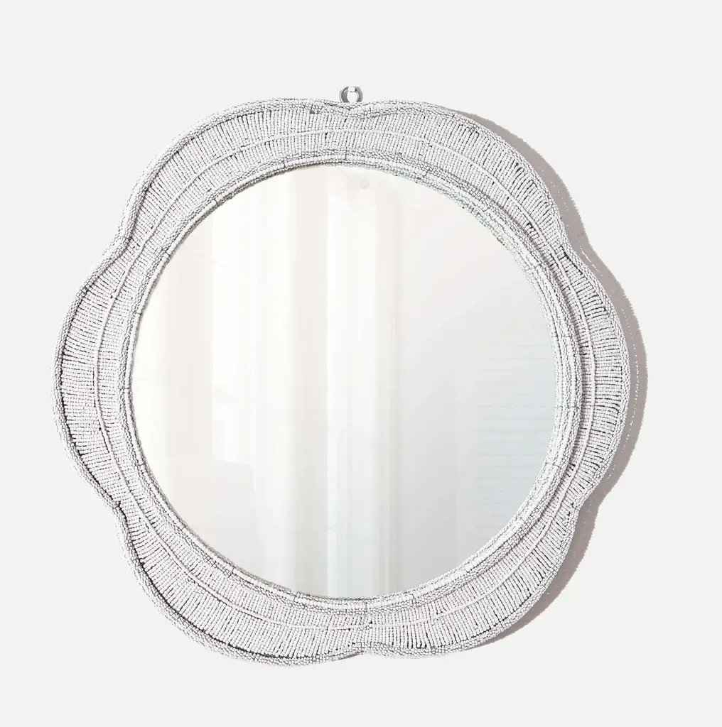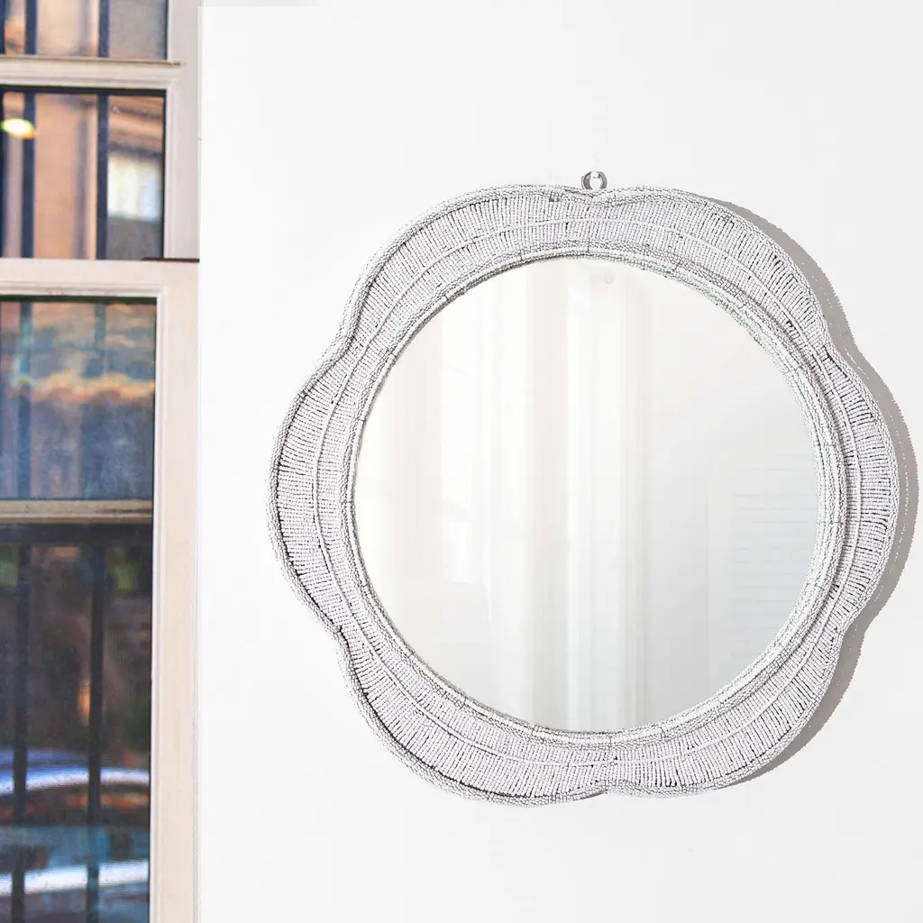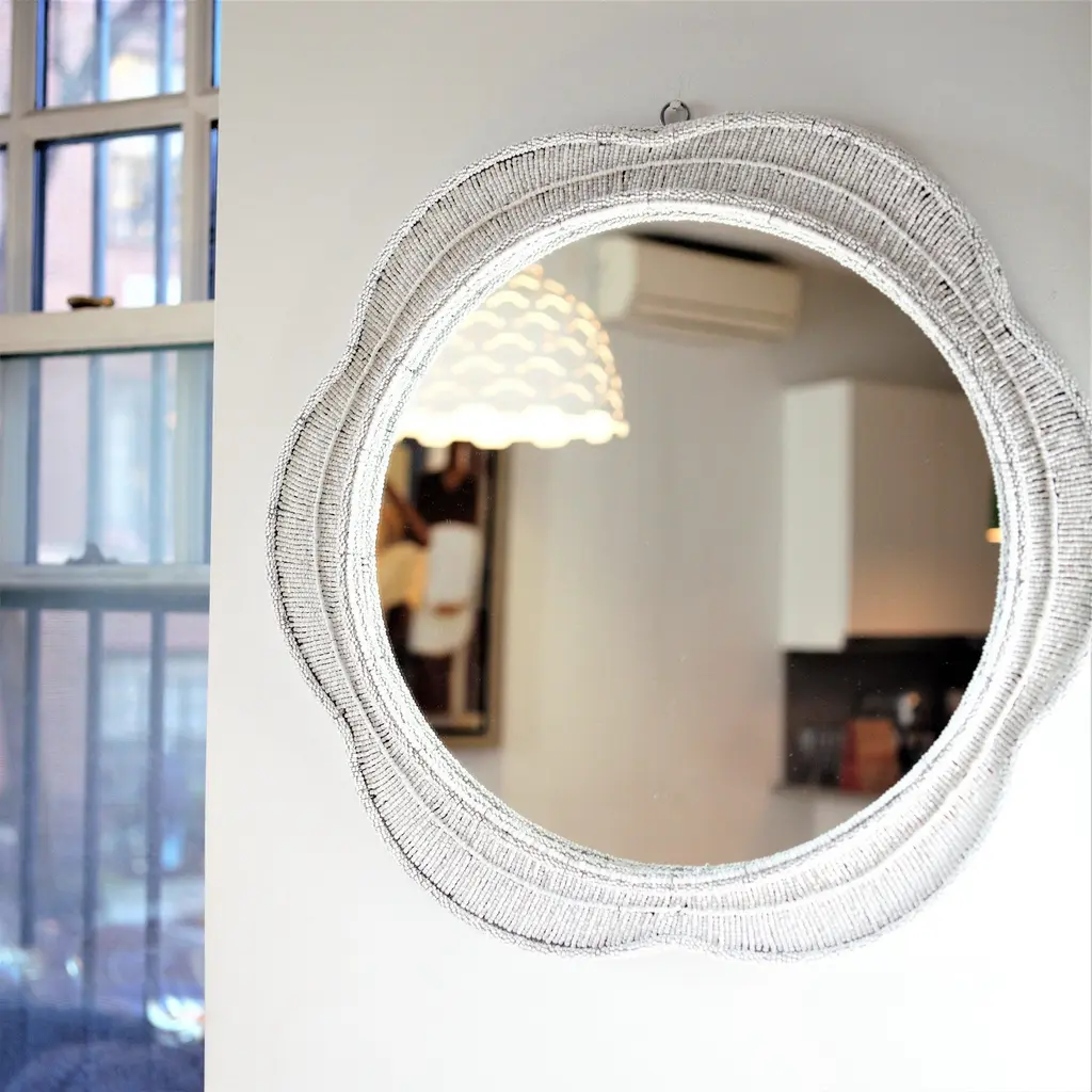 This Naka beaded African wall art mirror is inspired by centuries-old beadwork traditions of Southern Africa. The handmade piece is designed in Brooklyn, NY, and tightly and expertly beaded by Zimbabwean master beadsmiths. Explore hanging this African wall art mirror above a bathroom vanity or dress up a blank wall space in a guestroom or hallway. The mirror is backed by a metal frame, and comes with an insert point for easy hanging.