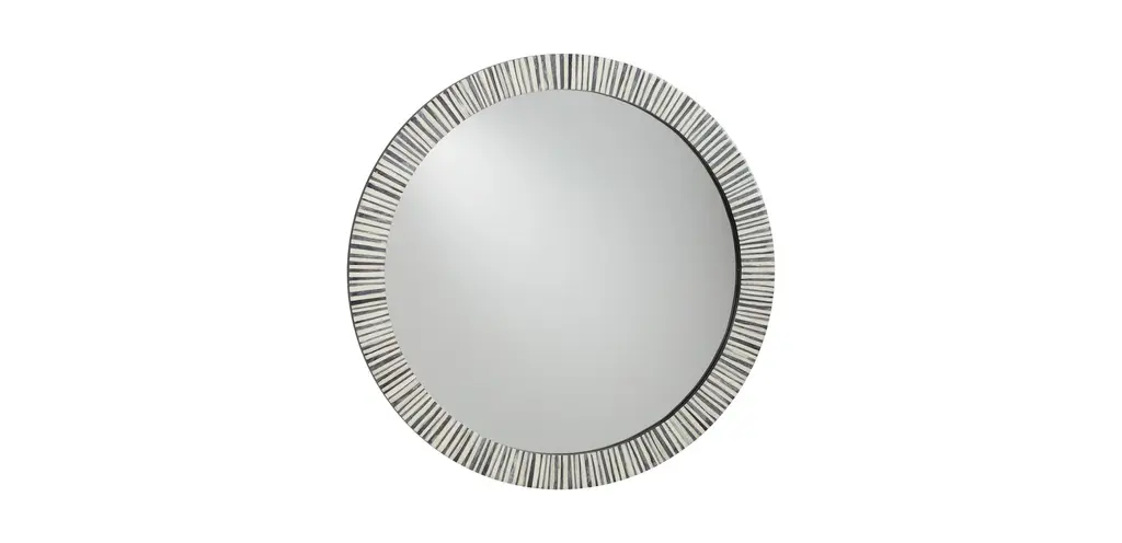 This bone inlay wall mirror is simply spectacular—and it’s all in the frame: the graphic ink-gray and ivory pattern is created from inlays that have been cut and applied by hand. Chic and unique, Nala can be styled any way you love it. Coordinate it with bold colored styles to bring out its fashionable flair, or keep this gorgeous round bone inlay wall mirror classic by floating it in a sea of sophisticated neutrals.