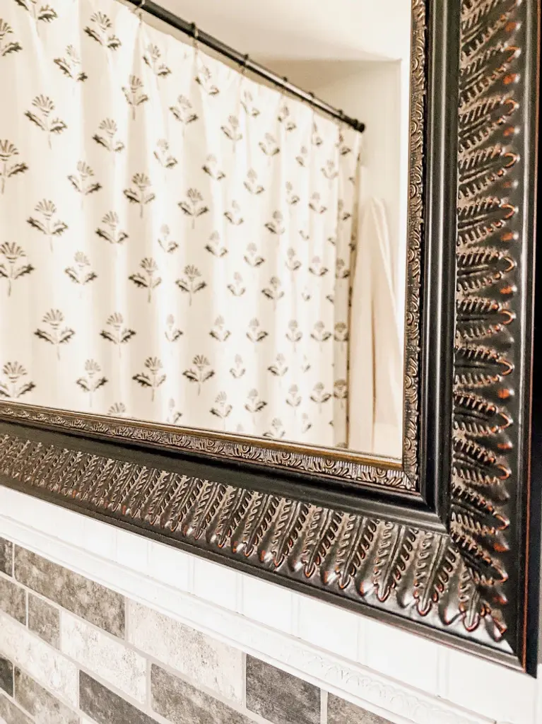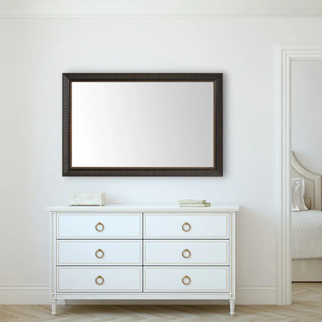 The bronze Napa framed mirror has a distinct botanical feel, with overlapping leaves that line the frame. The bronze finish is graduated from a dark, burnished tone to a brighter polish along the inner edge.Hangrail for installation will be applied on the width of the frame. All assembly hardware and instructions will be included. Additional hangrails are included if the opposite orientation is desired for installation. The dimensions displayed are the final outside dimensions of the frame, including the mirror. CATII safety backing applied on all mirrors. Approved for high-moisture areas such as bathrooms.