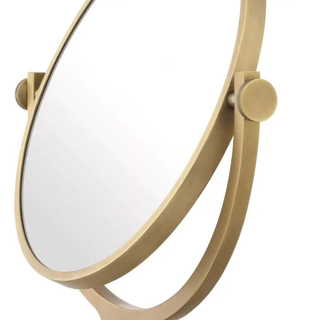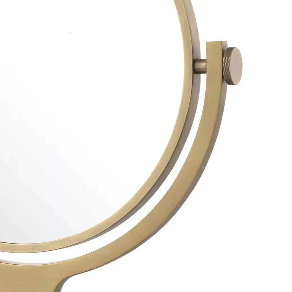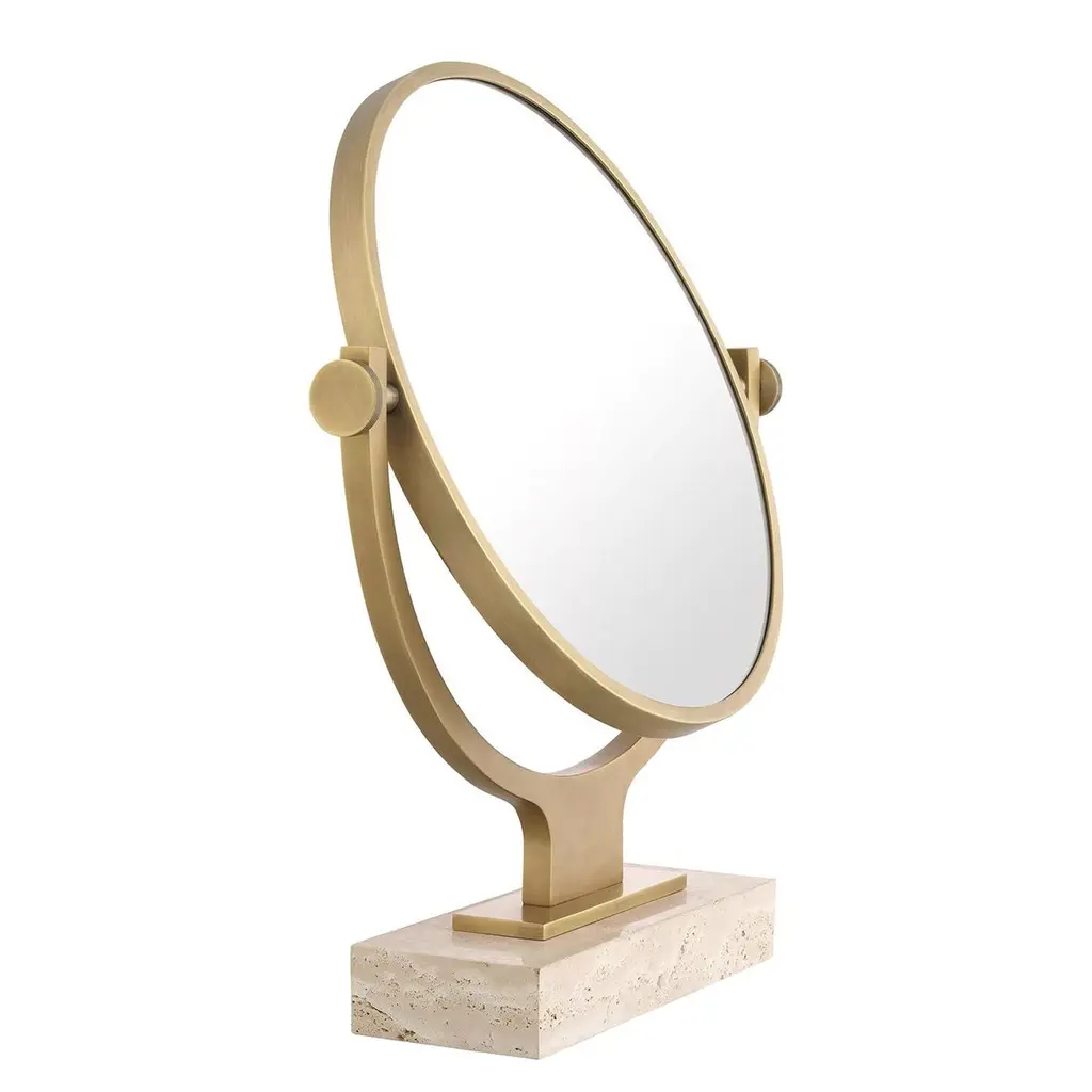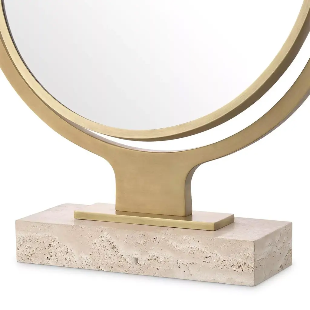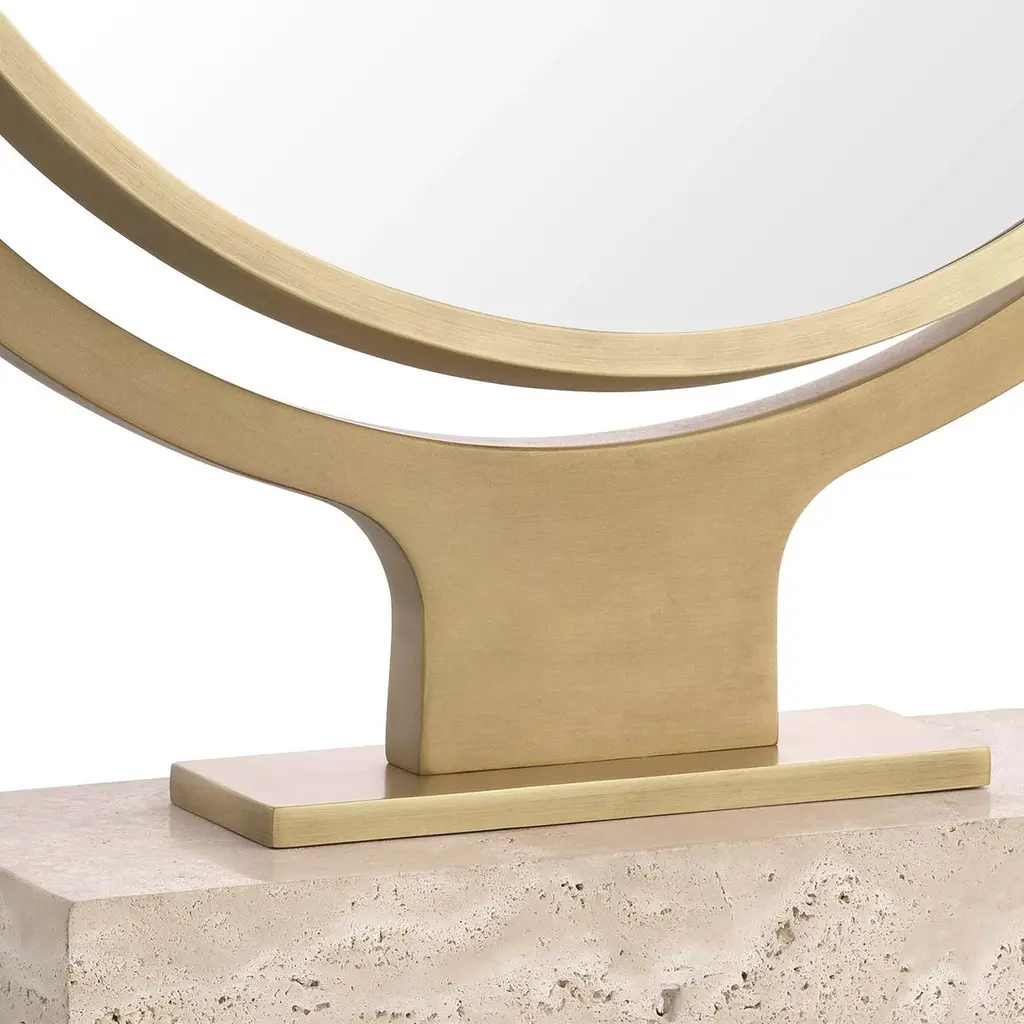 Mirror Narcisse with carved travertine base andstructure in brass and iron in antique finish. Withremovable round mirror glass.