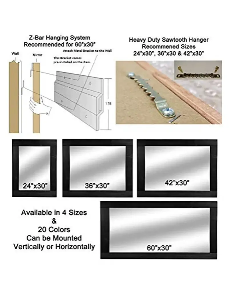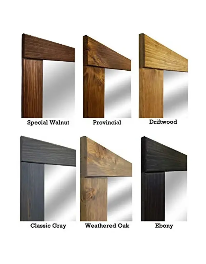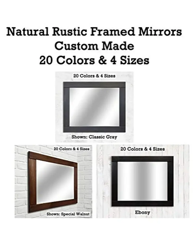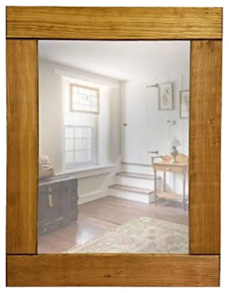 This attractive Natural Rustic Wood Framed Mirror is the perfect addition to any powder room, entry hall, office or just about any room needing some light and rustic charm. Our frame starts from the highest quality premium Kiln-Dried Square Edge Whitewood that meets the highest quality grading standards for strength and appearance. We hand bevel each edge, distress each surface and hand wipe stain to create that perfect rustic finish. We assemble these frames with a focus on exceptional build quality, we use high strength cabinet grade fasteners to assemble each joint and use only USA sourced 1/4 hand cut clear mirrored glass. Each frame will showcase its own unique grain patterns and knots making each and every frame unique. This Rectangular Design can be hung vertically or horizontally.Product Details:Each frame is hand crafted with its own unique characterEach frame is made to order, handmade in Warrington, PAHand cut quality USA sourced 1/4 inch clear mirror glassAvailable in 4 sizes: , 24" x 30", 36” x 30", 42" x 30” or 60” x 30”