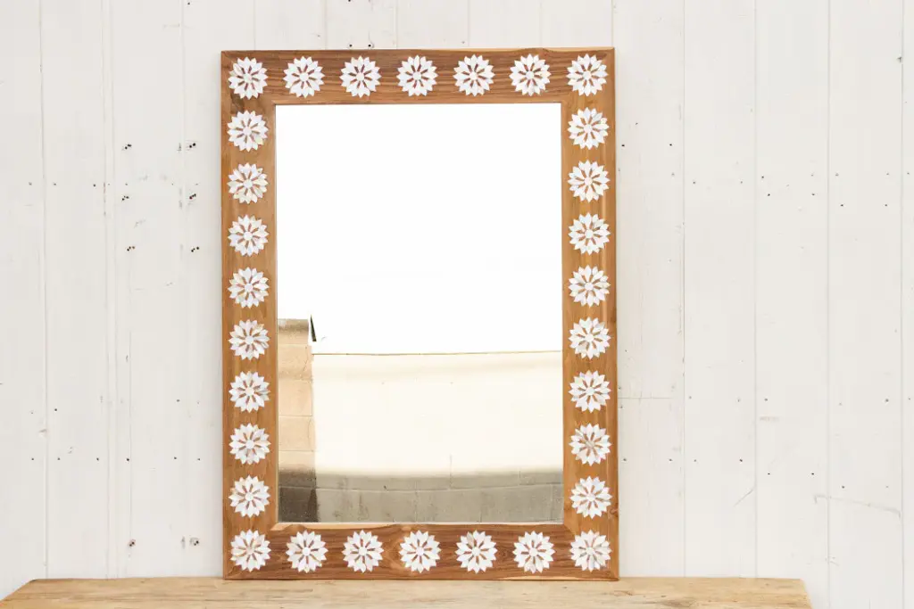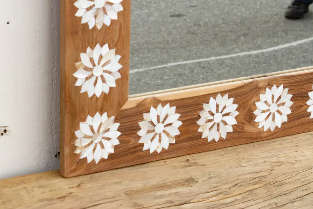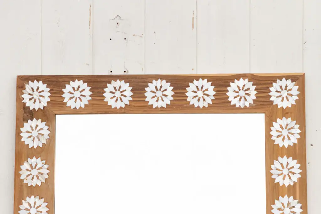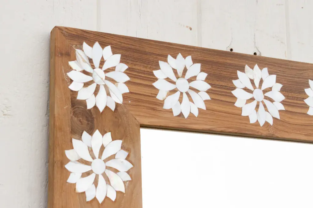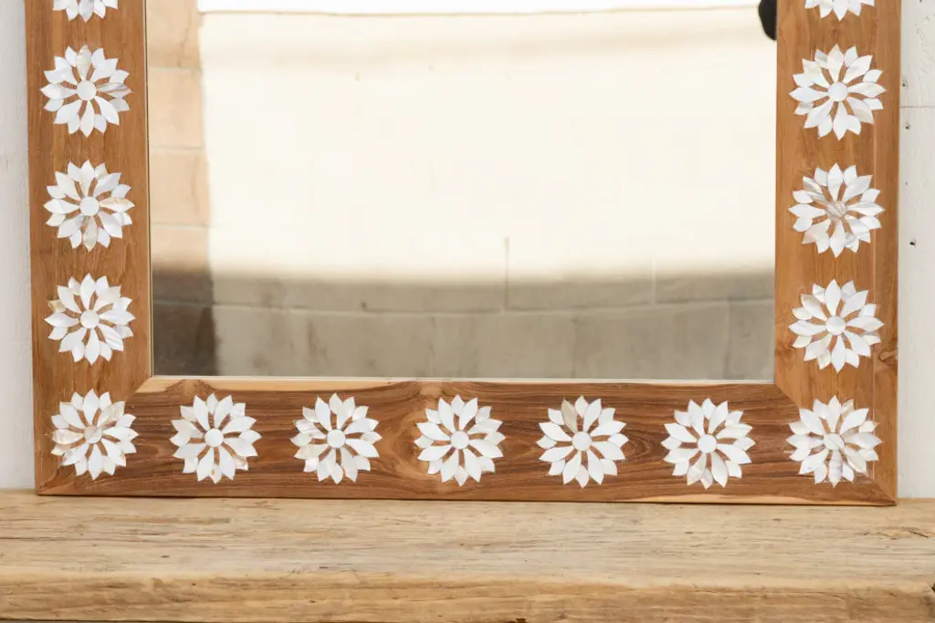 Showing clean contemporary lines contrasting with reclaimed teak and handmade inlay work. This beautiful boho modern mirror would be a staple in any home. Our blossom mother of pearl inlay collection is inspired by the opening of a lotus flower which is a symbol of purity and enlightenment. The reclaimed teak is hand-carved forming the flower shape, the inlay pieces are cut and carefully hammered into the wood to create the lovely lotus design.