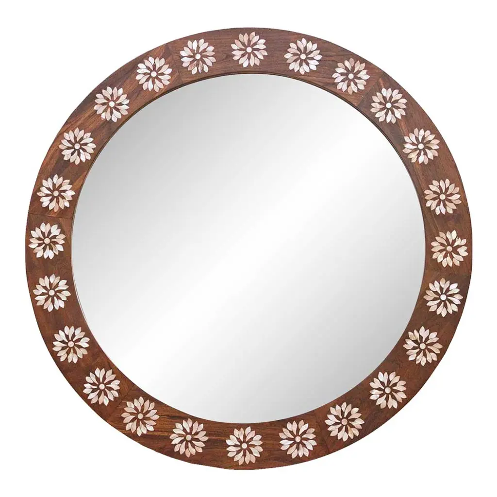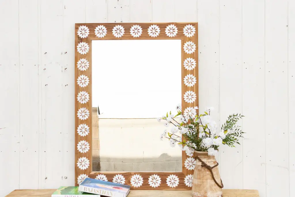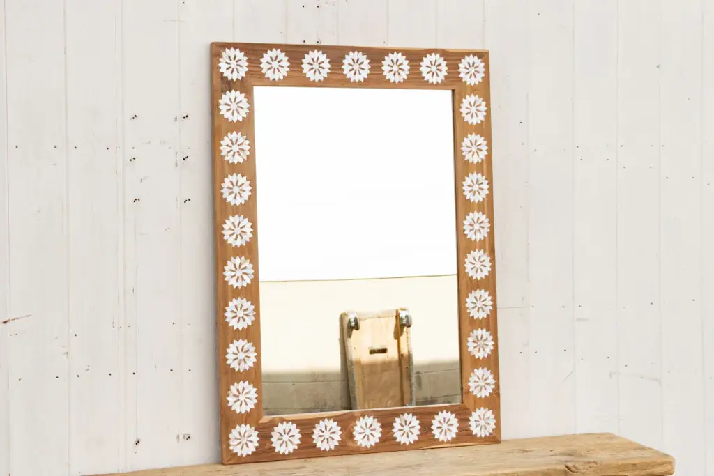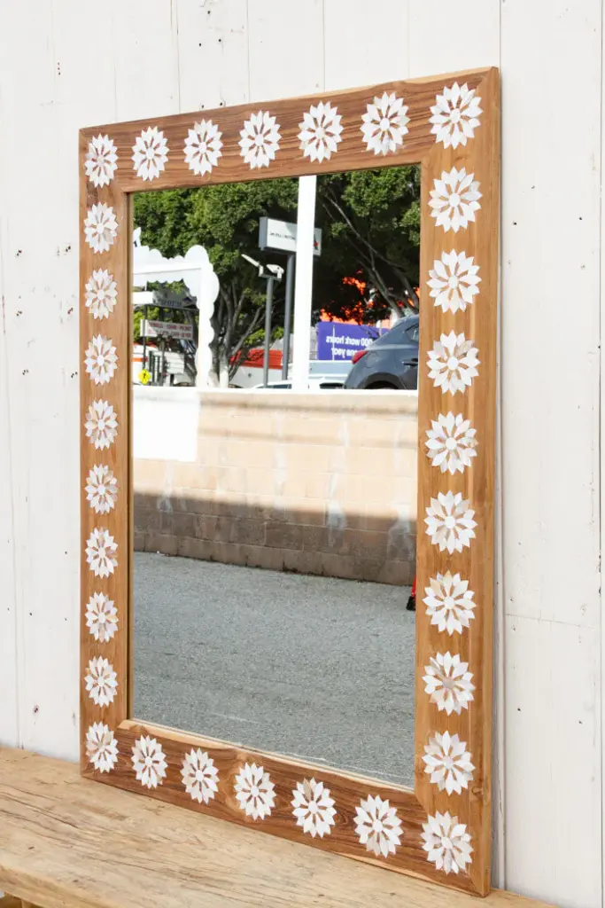 Showing clean contemporary lines contrasting with reclaimed teak and handmade inlay work. This beautiful boho modern mirror would be a staple in any home. Our blossom mother of pearl inlay collection is inspired by the opening of a lotus flower which is a symbol of purity and enlightenment. The reclaimed teak is hand-carved forming the flower shape, the inlay pieces are cut and carefully hammered into the wood to create the lovely lotus design.