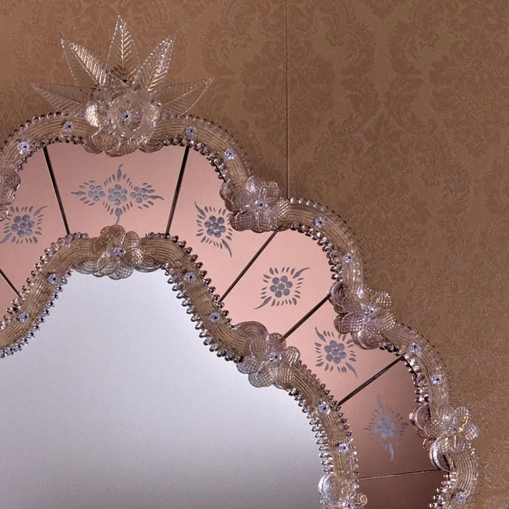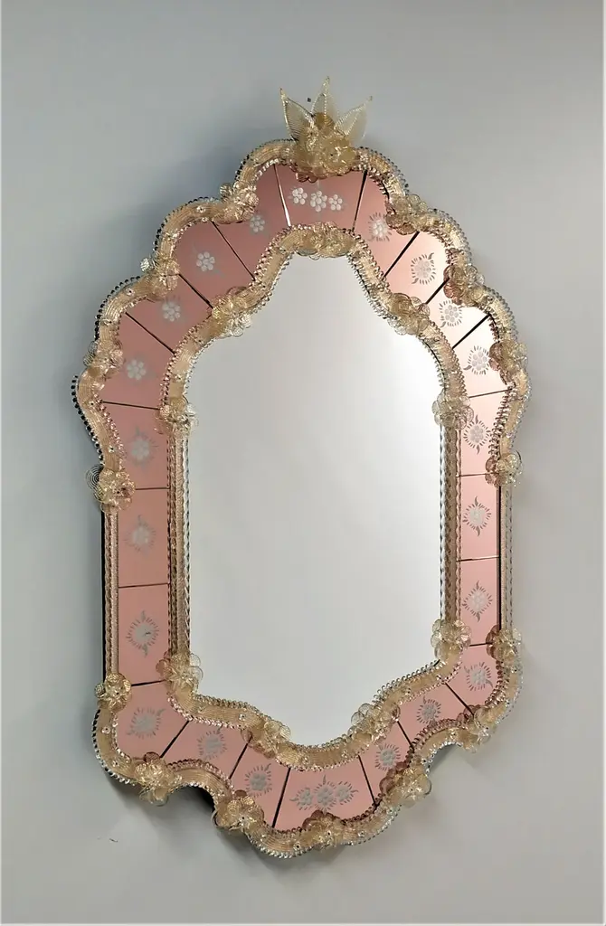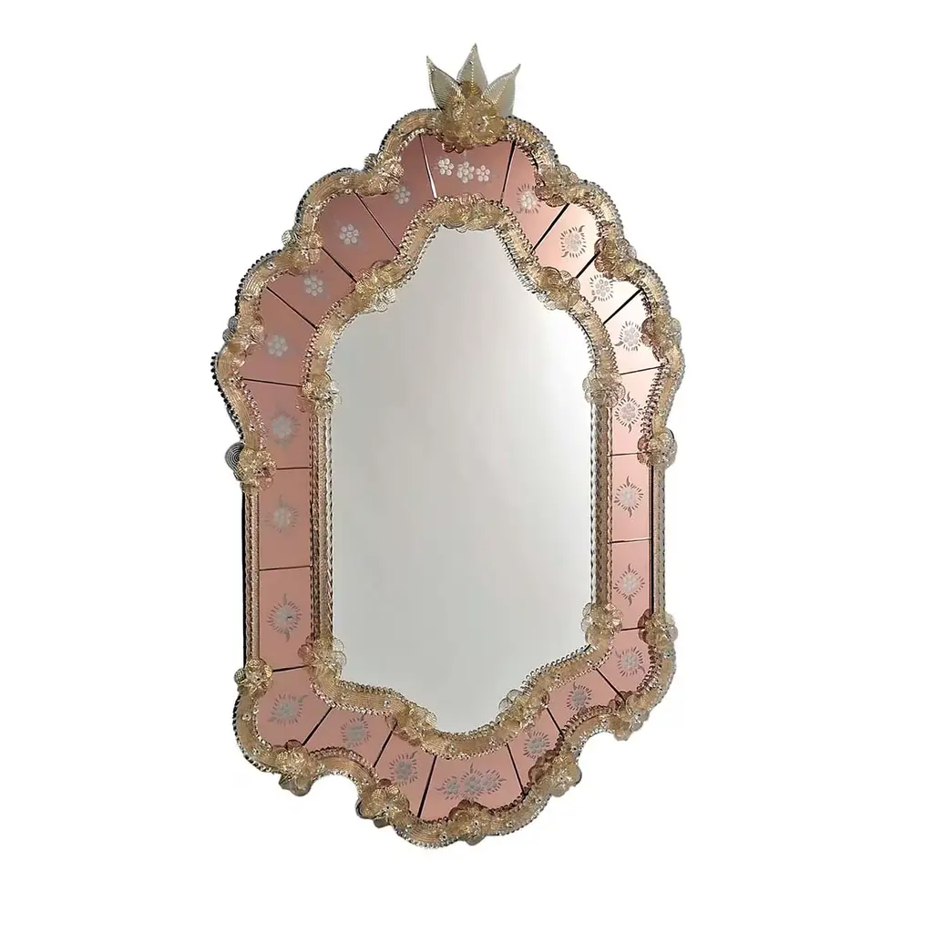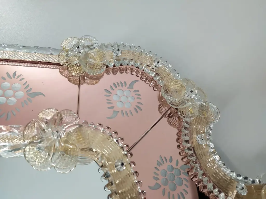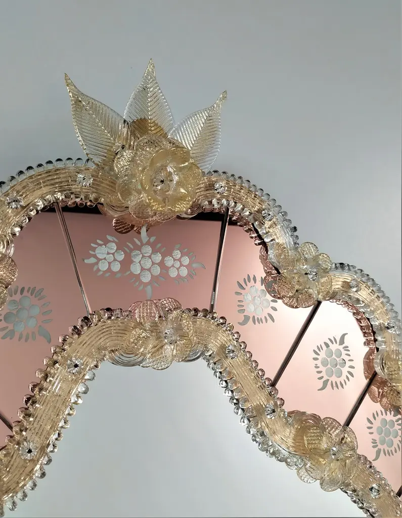 Bold yet feminine, this exceptional mirror handcrafted by Venetian master glassmakers will be a splendid focal point in classic or eclectic decors. The indented frame in golden crystal accented with matching leaves and flowers follows the sinuous profile of the outer section in pink-toned mirrored glass, which is adorned with handmade floral etchings that complete the piece. Handcrafted according to 14th-century glass techniques.