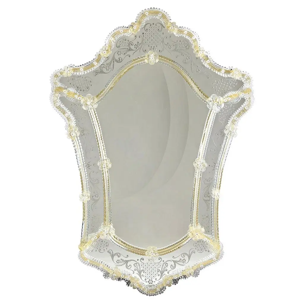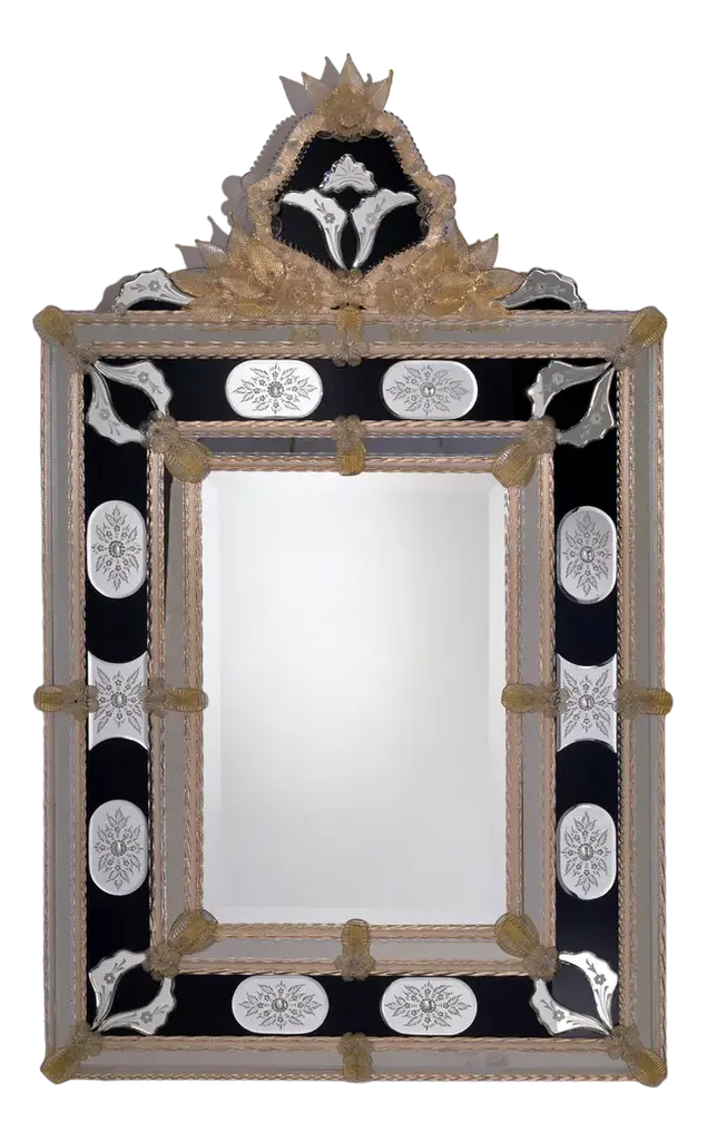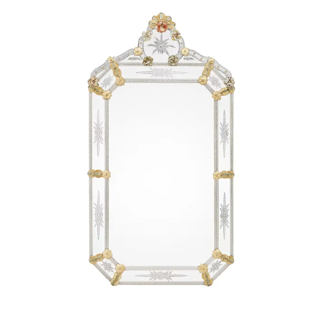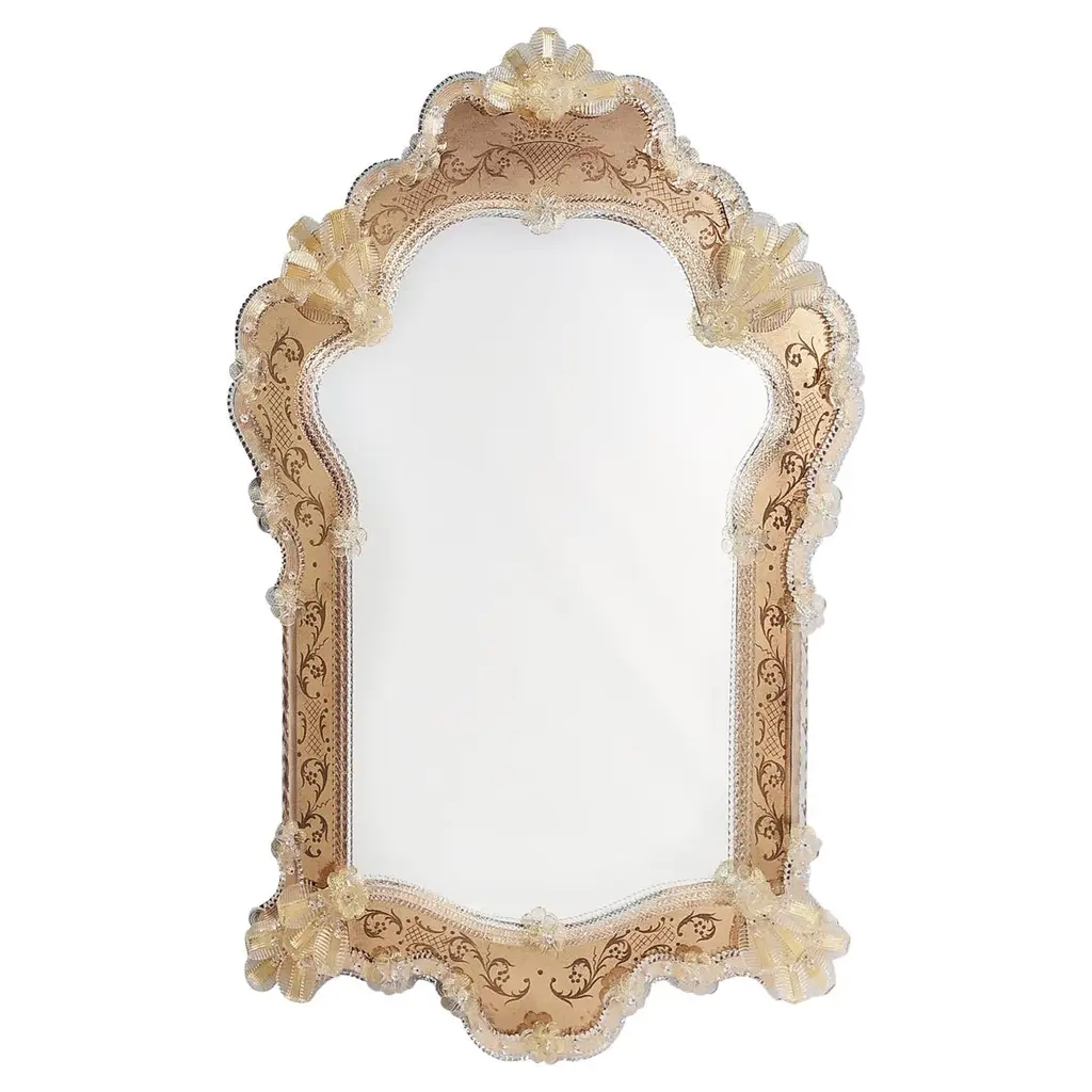 Bold yet feminine, this exceptional mirror handcrafted by Venetian master glassmakers will be a splendid focal point in classic or eclectic decors. The indented frame in golden crystal accented with matching leaves and flowers follows the sinuous profile of the outer section in pink-toned mirrored glass, which is adorned with handmade floral etchings that complete the piece. Handcrafted according to 14th-century glass techniques.