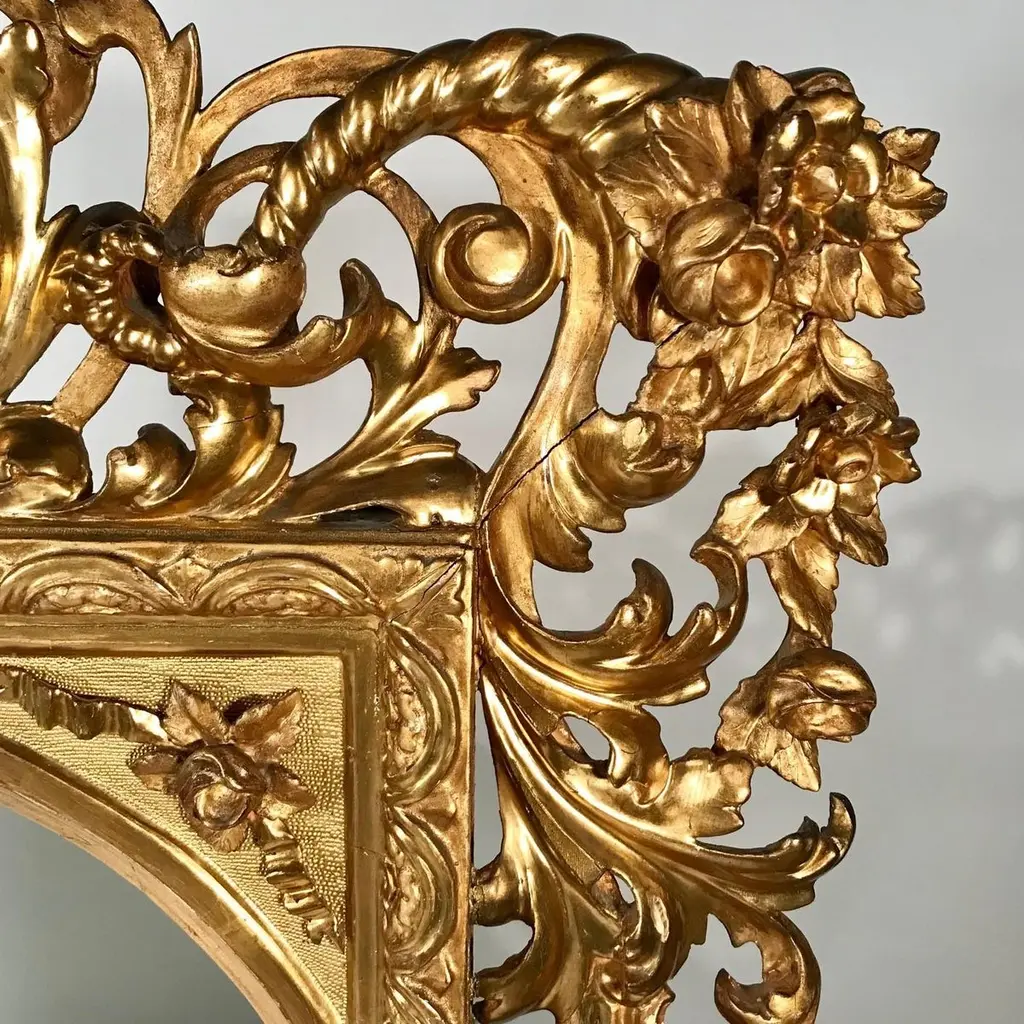 These Florentine mirrors are well-carved and gilt with scrolling acanthus and foliate motifs which create a lively background for the arched mirror plates. They are substantially, though not entirely, identical. A point of difference is the motifs in the spandrils on either side of the arch. They would make excellent frames for a pair of portraits or as pier mirrors in a dining room.