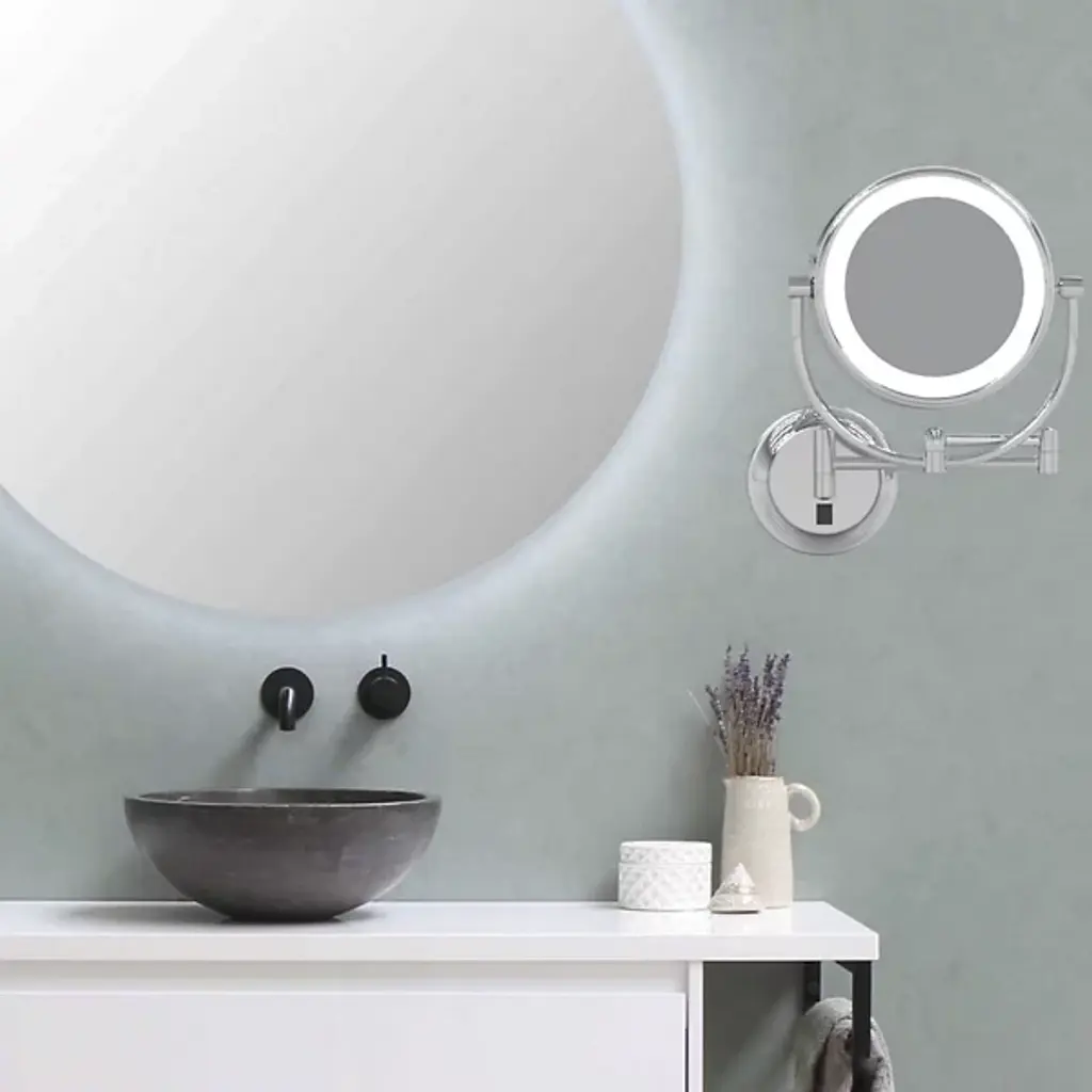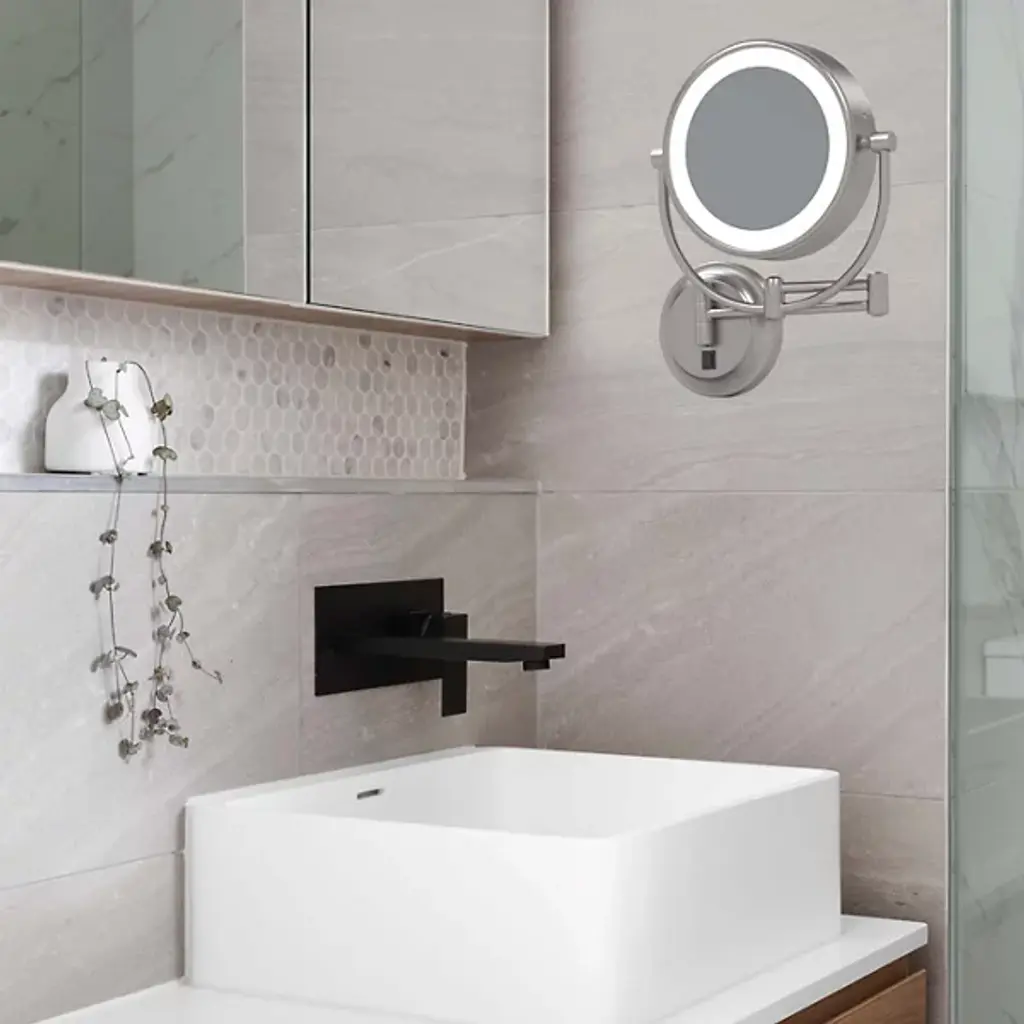 The Neo Modern LED Wall Mounted Mirror transforms your daily grooming routine with high functionality. Dual articulated arms emerge from a circular wall plate, offering exceptional reach and positioning flexibility. This round mirror features dual 5x and 1x magnification, and innovative dual-color LED lighting, with a 3-way toggle switch transitioning seamlessly between warm white and cool white illumination. Contemporary metal construction and damp-listed components ensure lasting service, while the sophisticated design complements modern bathroom aesthetics.