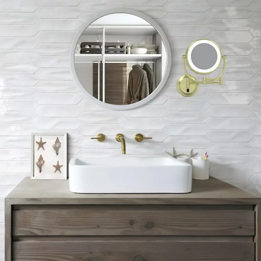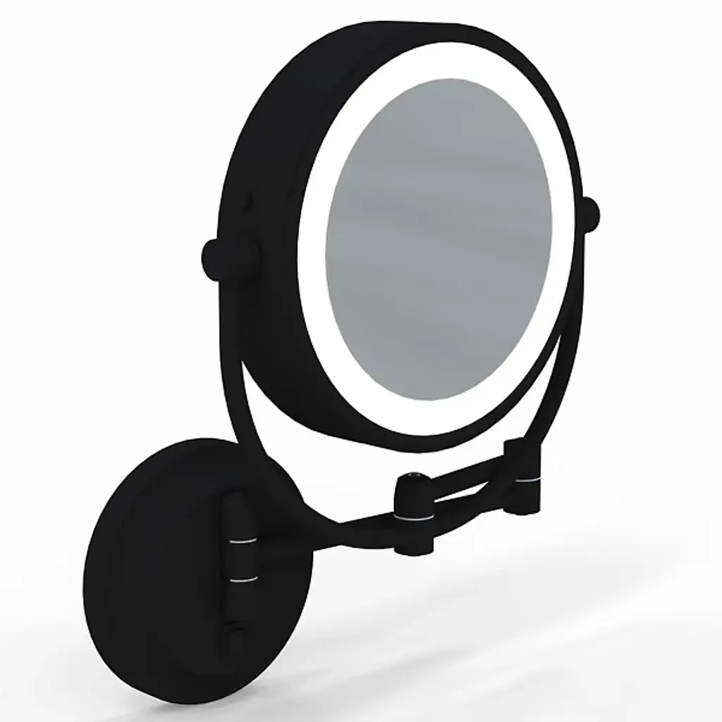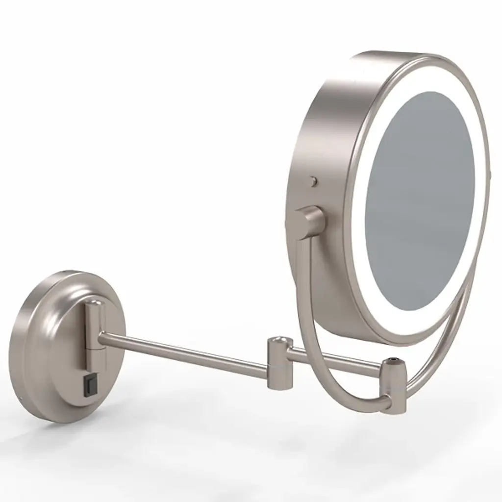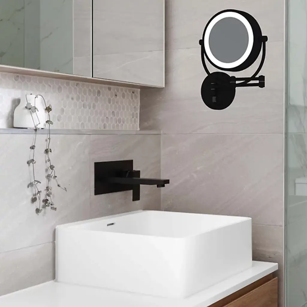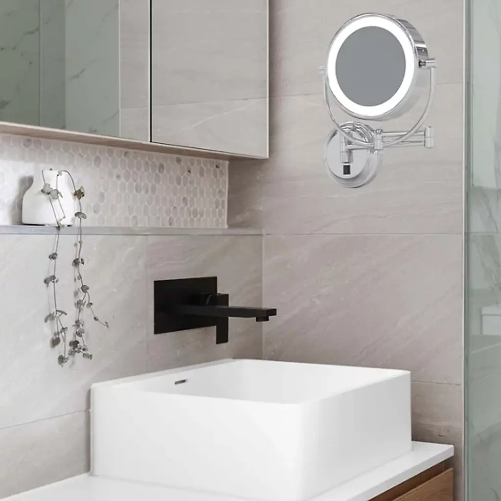The Neo Modern LED Wall Mounted Mirror transforms your daily grooming routine with high functionality. Dual articulated arms emerge from a circular wall plate, offering exceptional reach and positioning flexibility. This round mirror features dual 5x and 1x magnification, and innovative dual-color LED lighting, with a 3-way toggle switch transitioning seamlessly between warm white and cool white illumination. Contemporary metal construction and damp-listed components ensure lasting service, while the sophisticated design complements modern bathroom aesthetics.