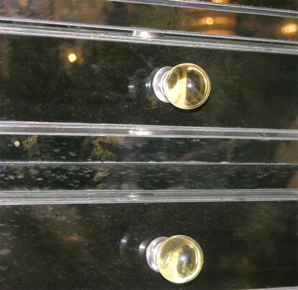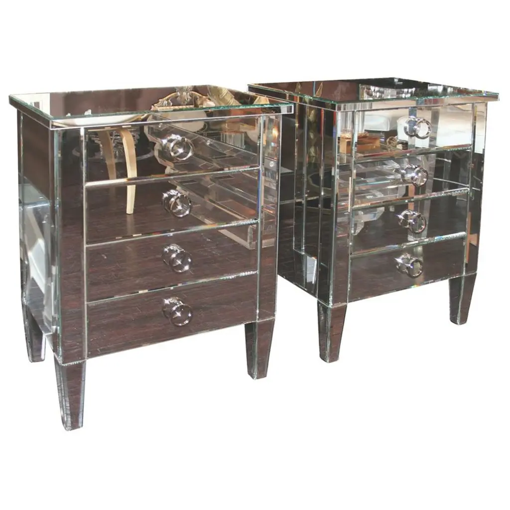 Custom Neoclassical Modern 3-drawer diamond front beveled smoked mirror nightstand. Customization is available in different sizes, finishes and hardware.
