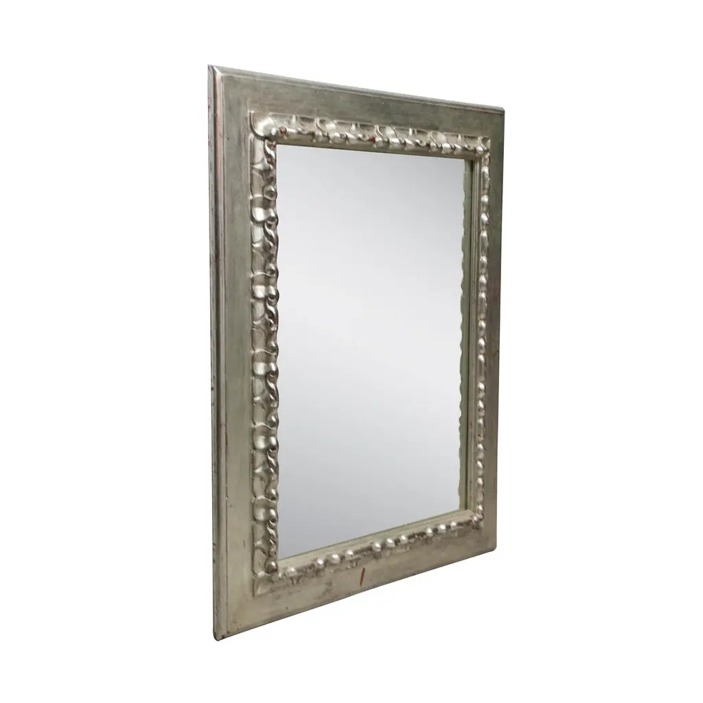 Neoclassical Regency style handcrafted mirror. Rectangular hand carved wooden structure with silver foiled finish, Spain, 1970.