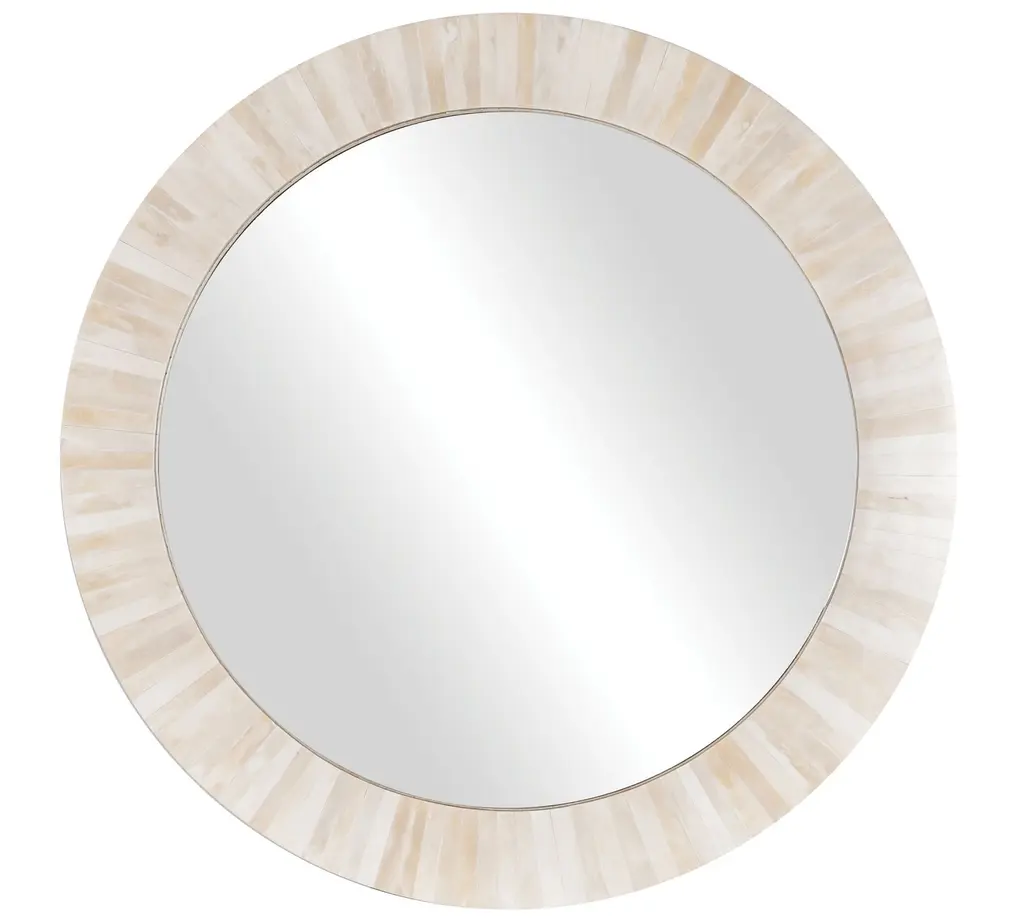 Tile by tile, bone is inlaid by hand around a gleaming mirror to craft the Nevaeh Round White Bone Wall Mirror. As versatile as it is beautiful, this is one accent that can be interpreted as global, coastal or eclectic.
