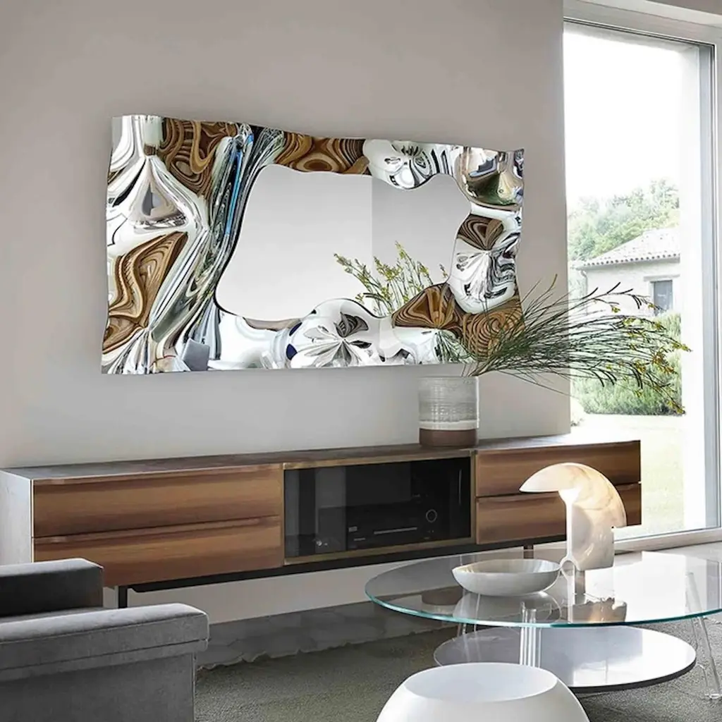NEW IN BOXCurved glass + central mirror - standardPICTURES ARE FOR REFERENCEWall mirror in 6 mm high temperature fused glass, back-silvered. 5 mm flat mirror. Rear frame in painted metal. Can be hung in various positions.