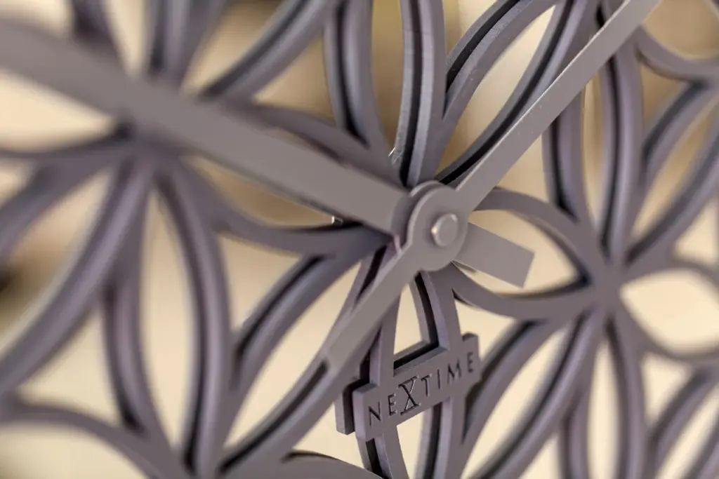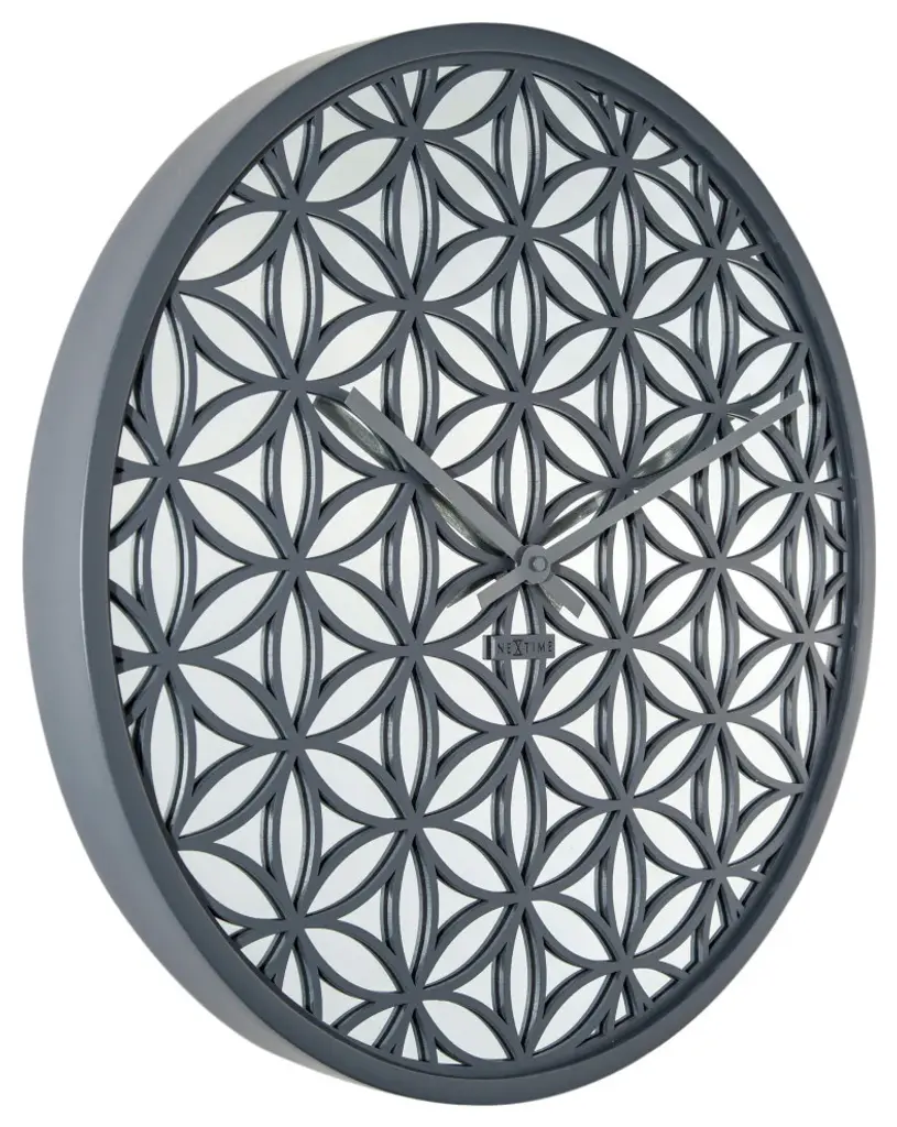 The NeXtime "Bella Mirror" is a large wall clock designed by Jette Scheib. The case and flower pattern are made of wood with a mirrored glass behind it. This silent clock gives an oriental feeling to your home. It runs on 1 AA battery (not included). 19.7 inches/ 50cm. Comes in white or grey.