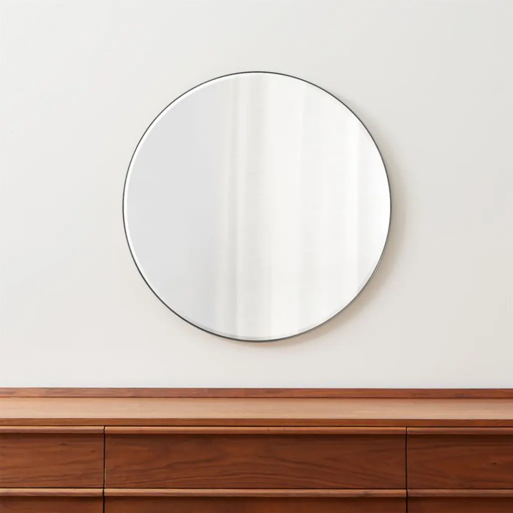 The Nicky Mirror has no frame, no decoration, no finishes. Just its simple, beautiful self. It is a circle with a simple beveled edge. Alone or in multiples, the Frameless Mirror is a perfect accent piece for an entryway, bathroom, bedroom or any room in your home. D-rings are affixed to the back of the mirror so it is ready to hang right out of the box!