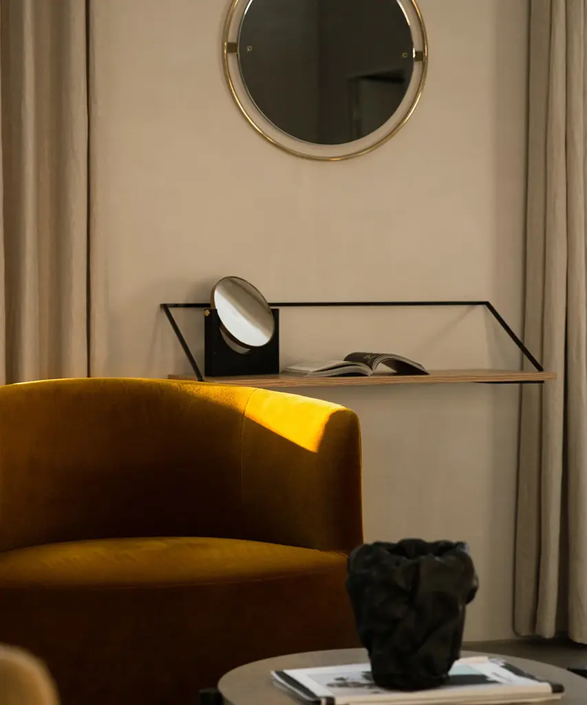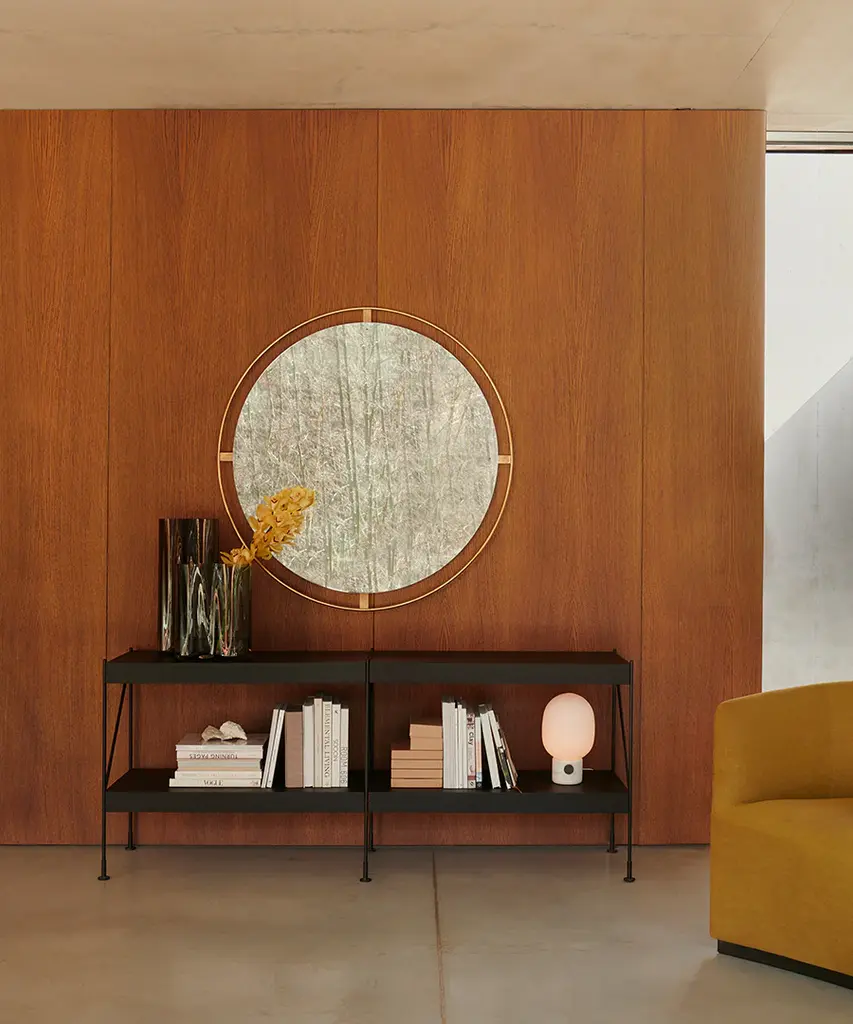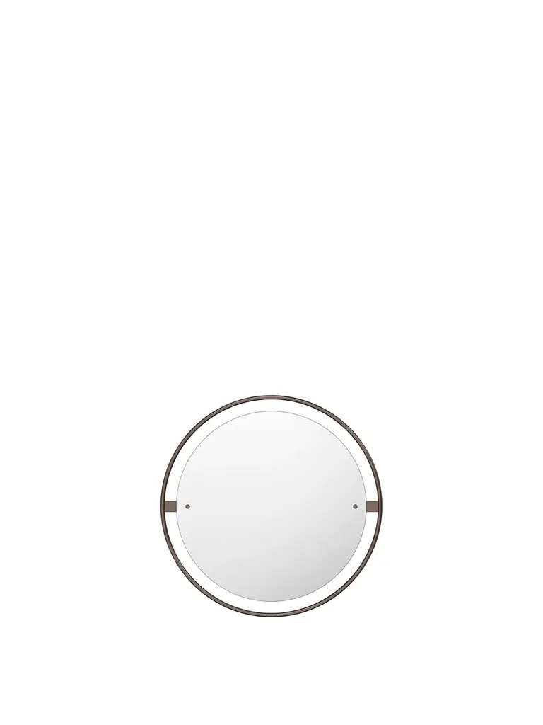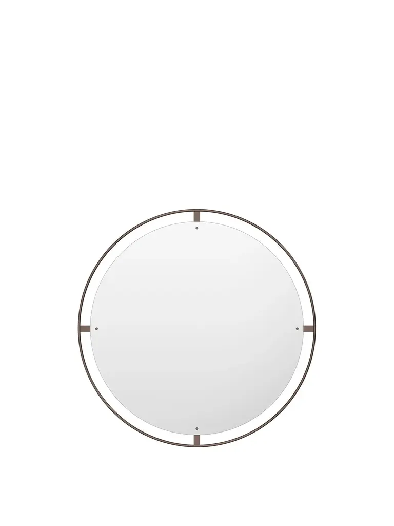 The Nimbus Mirror is a beautifully-conceived study of form and function. Surrounded with a bronzed or polished solid brass frame, held in place with decorative screws, the Nimbus mirror is both a functional object, as well as a decorative addition to homes, hotels or offices. Designed by Kroyer-Saetter-Lassen for Danish Design company Audo Copenhagen.