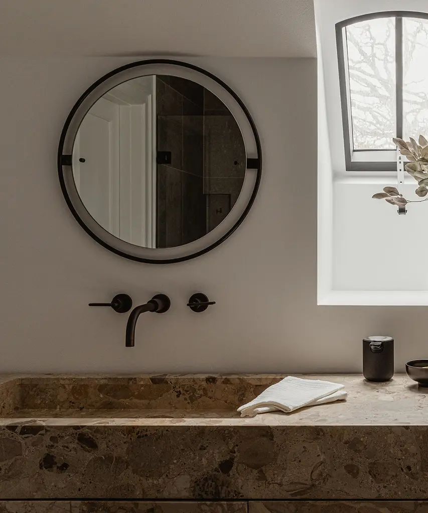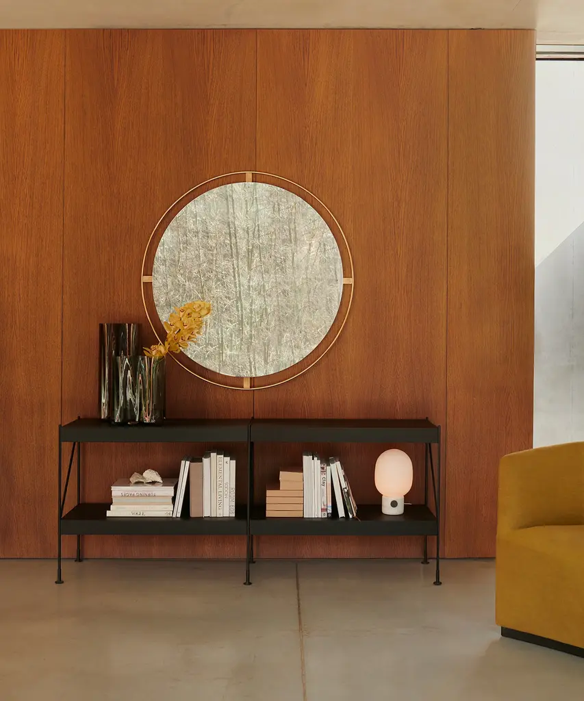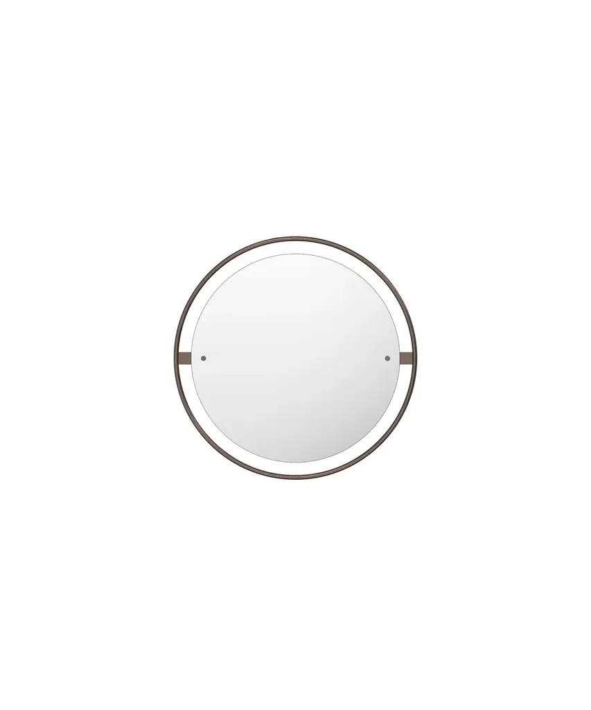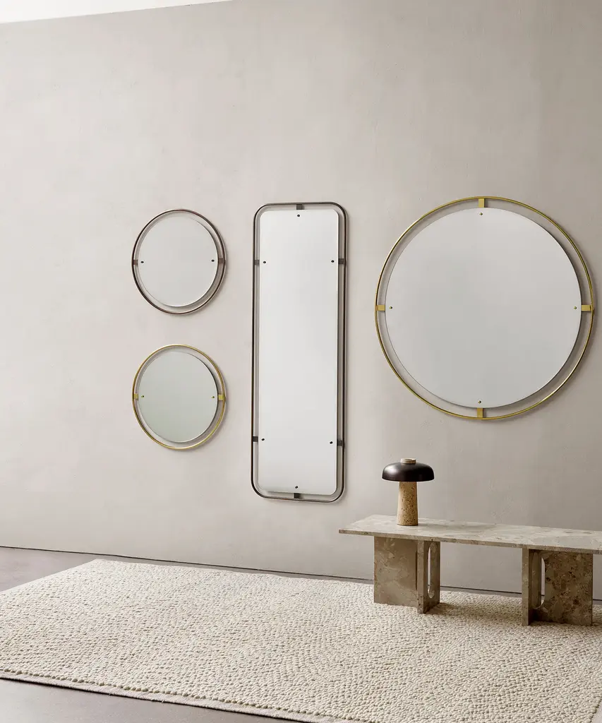 The Nimbus Mirror is a beautifully-conceived study of form and function. Surrounded with a bronzed or polished solid brass frame, held in place with decorative screws, the Nimbus mirror is both a functional object, as well as a decorative addition to homes, hotels or offices. Designed by Kroyer-Saetter-Lassen for Danish Design company Audo Copenhagen.