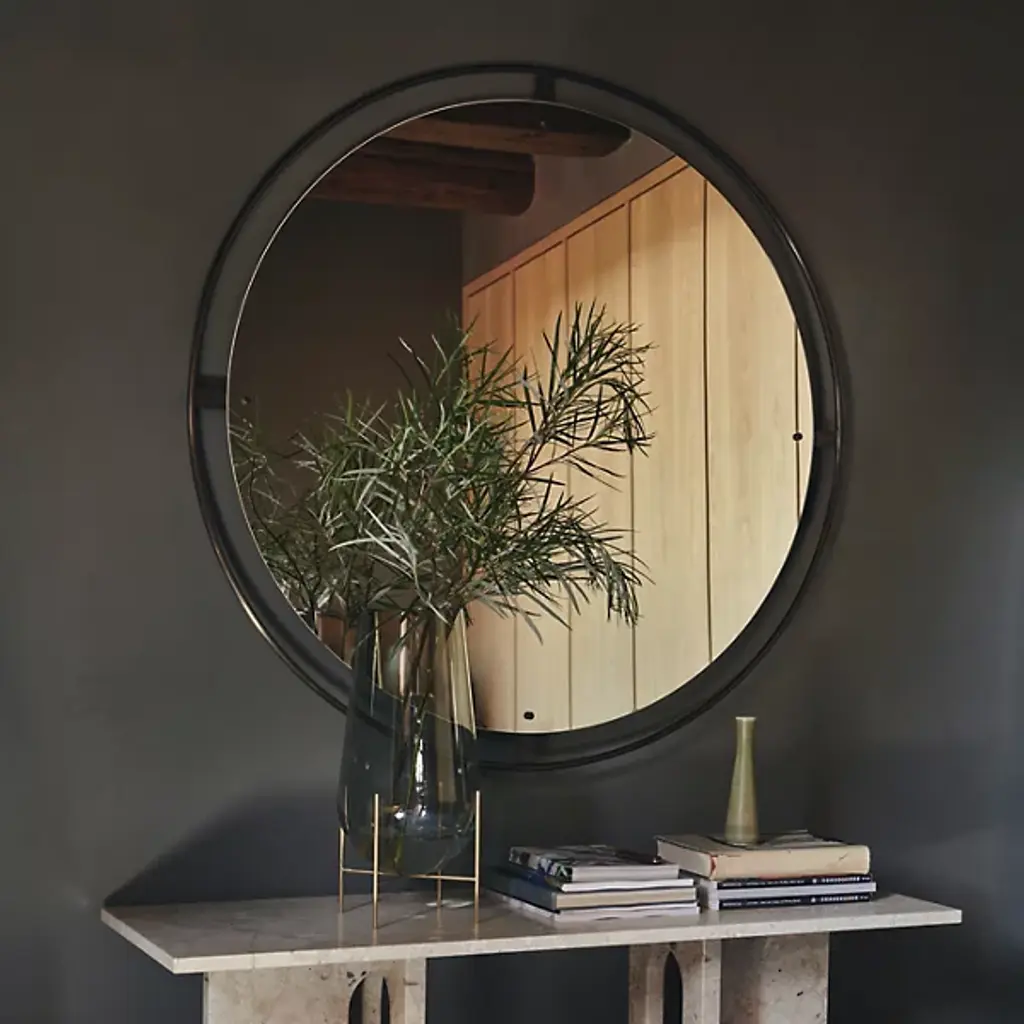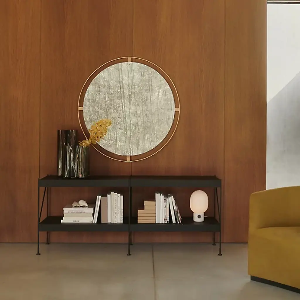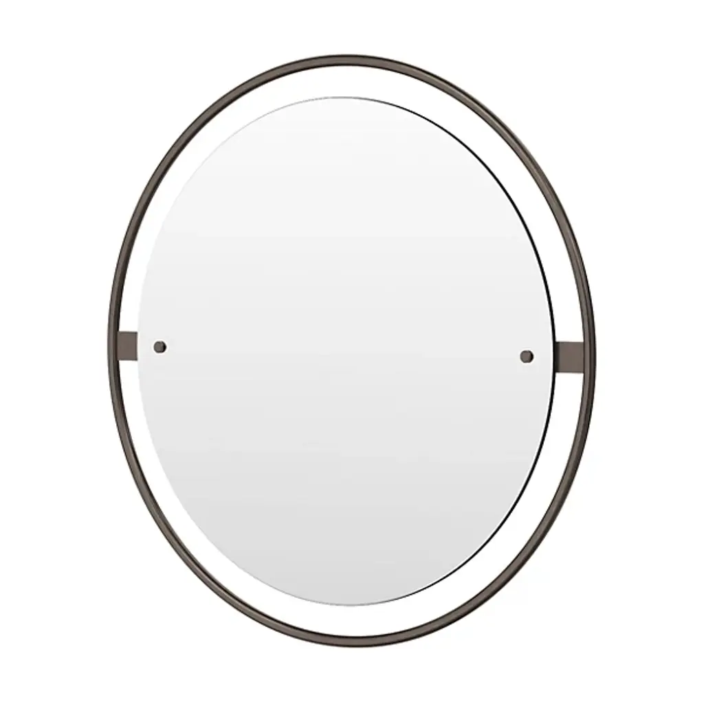 Accent your home with the artistic, reflective surface of the Nimbus Round Mirror from Audo Copenhagen, formerly known as Menu. A casual, comforting piece designed by Copenhagen studio Krøyer-Sætter-Lassen, this mirror is the result of studying how to add a frame without detracting from the natural appeal of the mirror surface. The darker frame wraps gently around the mirror, leaving a slight gap that contrasts with the magnificent glass surface, evoking the mythological Greek name of the shining cloud that accompanied deities, as it reveals the décor of the room around it.