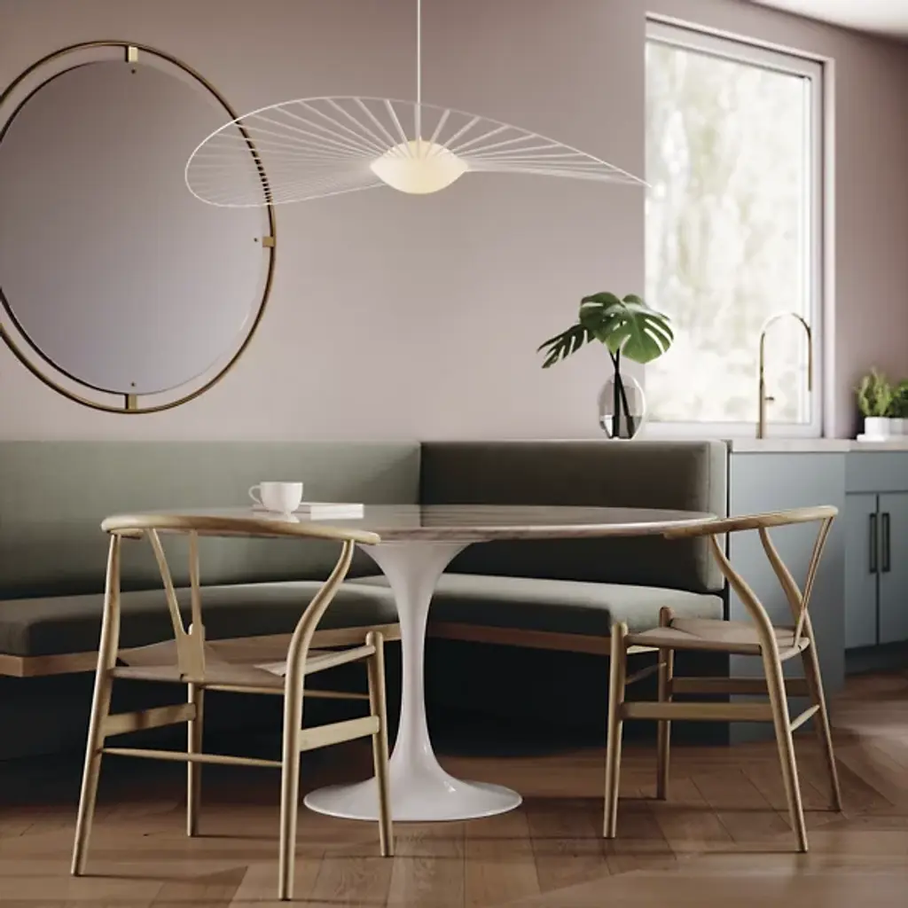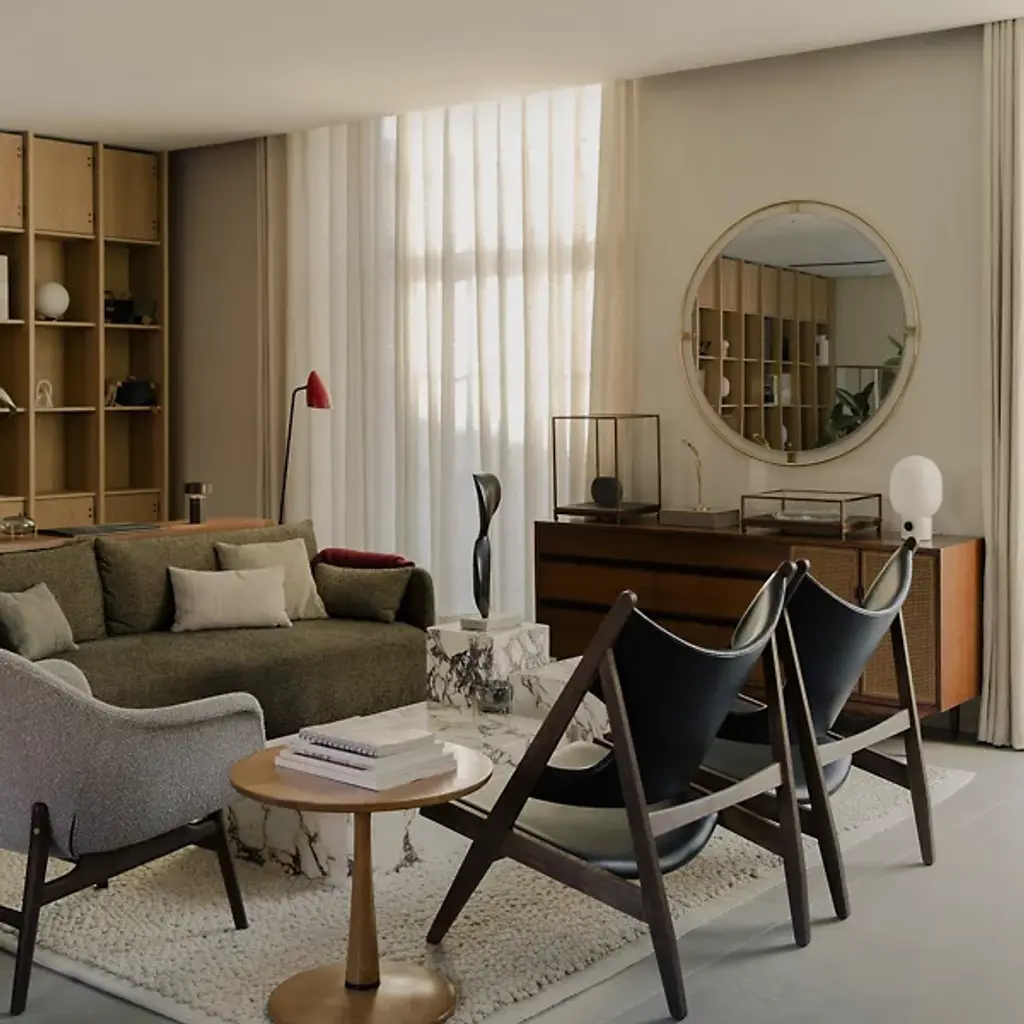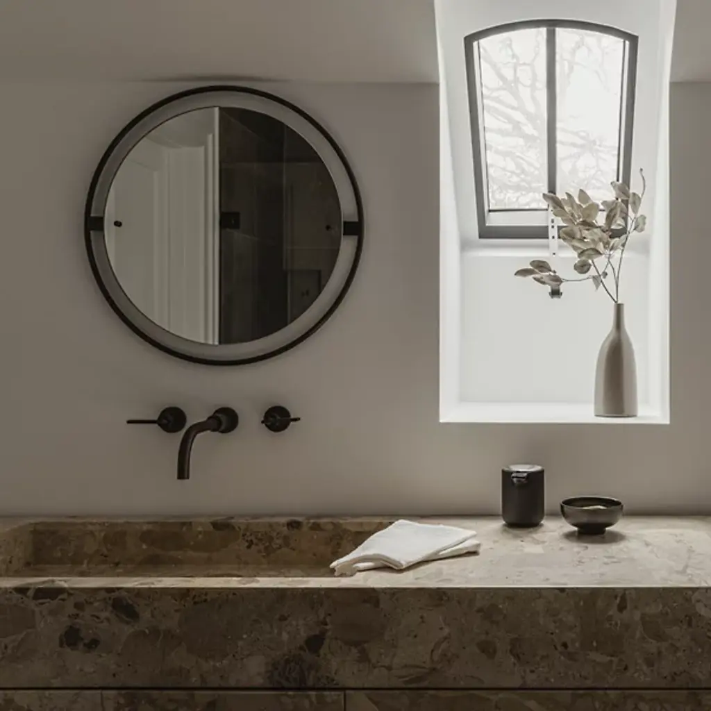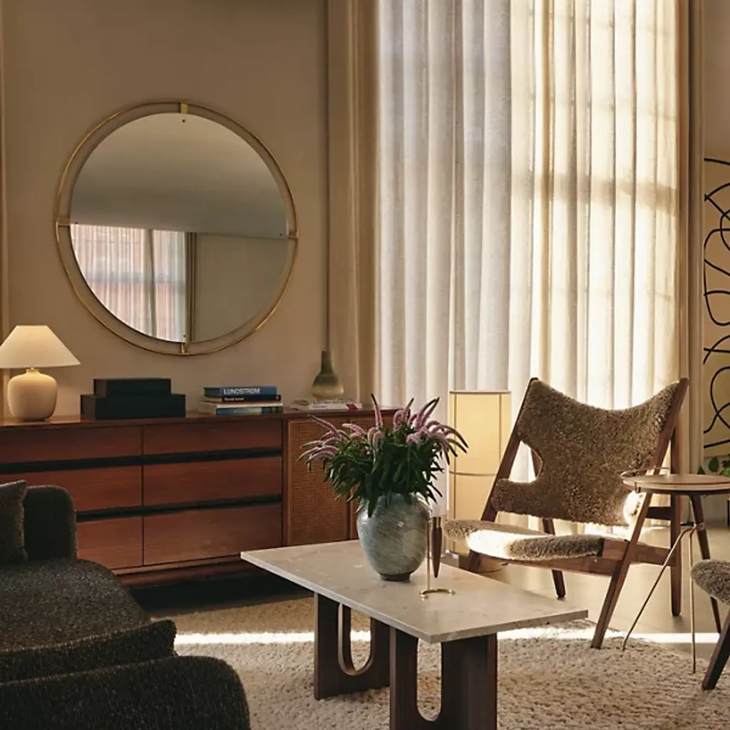 Accent your home with the artistic, reflective surface of the Nimbus Round Mirror from Audo Copenhagen, formerly known as Menu. A casual, comforting piece designed by Copenhagen studio Krøyer-Sætter-Lassen, this mirror is the result of studying how to add a frame without detracting from the natural appeal of the mirror surface. The darker frame wraps gently around the mirror, leaving a slight gap that contrasts with the magnificent glass surface, evoking the mythological Greek name of the shining cloud that accompanied deities, as it reveals the décor of the room around it.