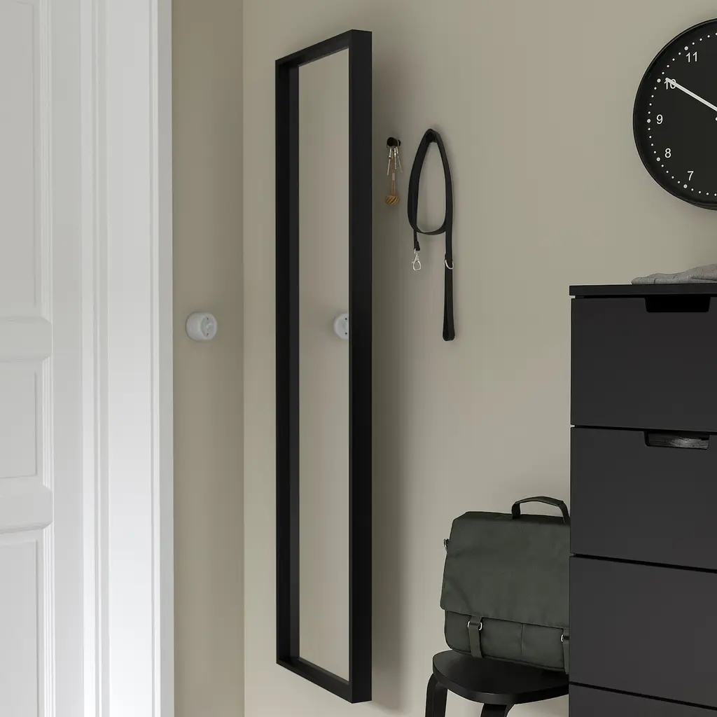 NISSEDAL Mirror - black 15 3/4x59 ". The mirror can be angled if you choose to mount it with the enclosed hinges. Can be hung horizontally or vertically. Safety film reduces damage if glass is broken. Suitable for use in most rooms, and tested and approved for bathroom use.