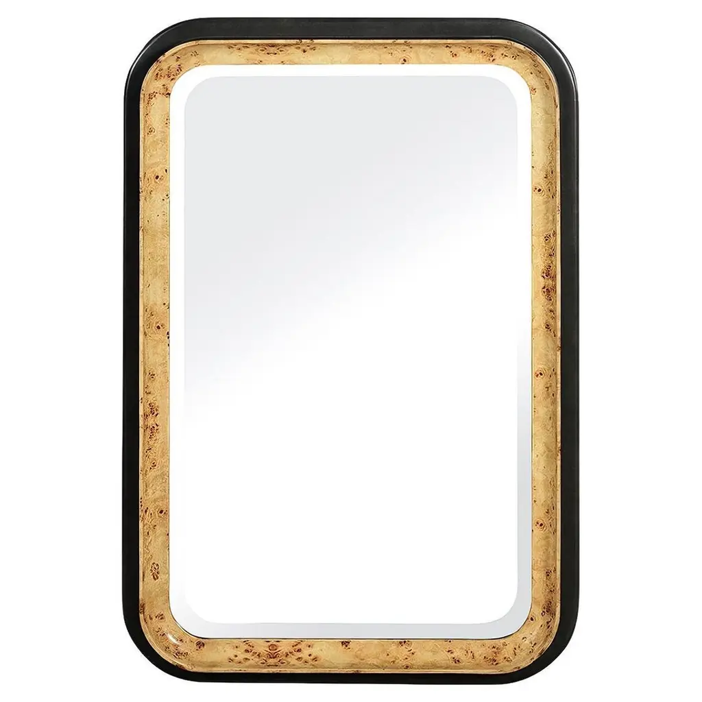 Deep forged iron with tapered sides finished in a lightly antiqued metallic gold leaf on the inside, and a heavily distressed black with gold undertones on the outside. Mirror has a generous 1-1/4" bevel. May be hung horizontal or vertical.