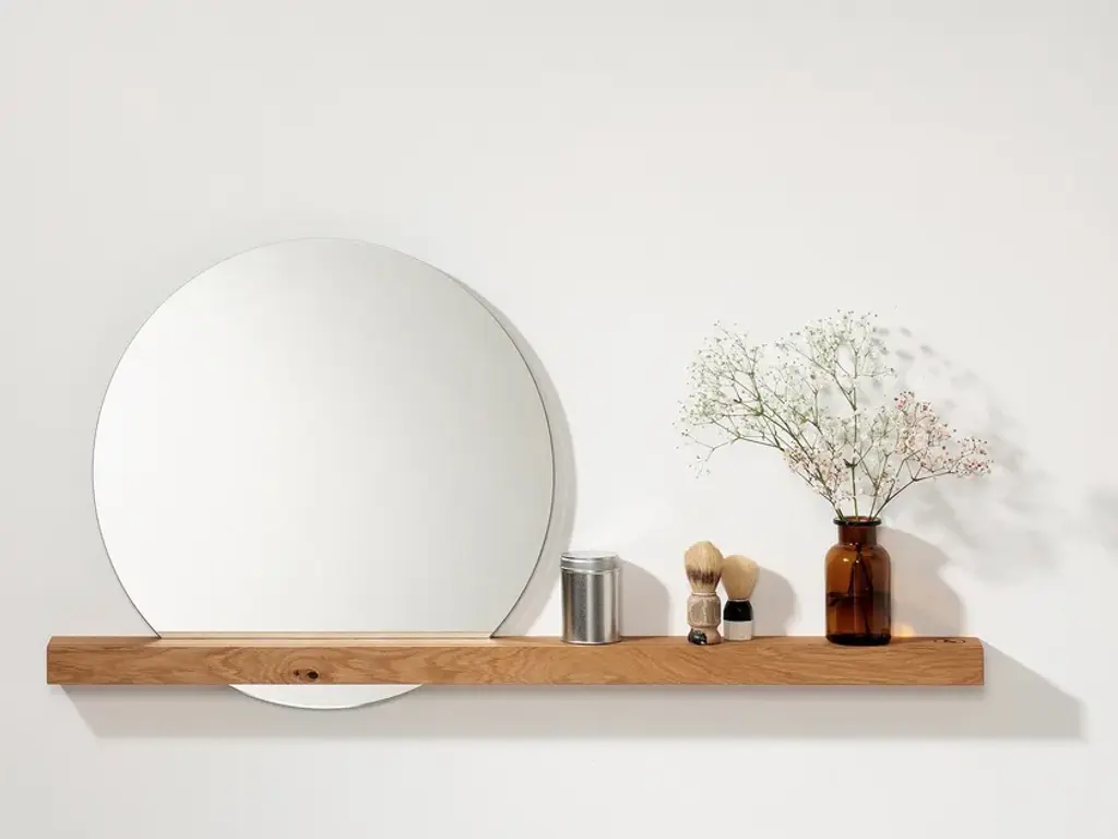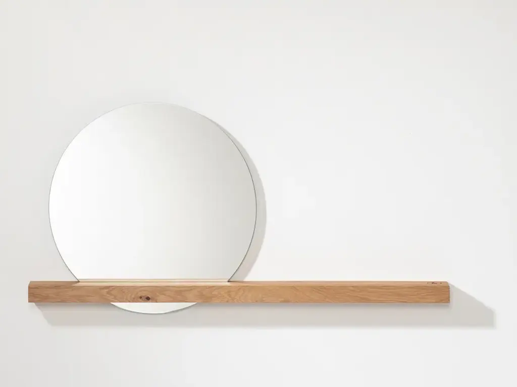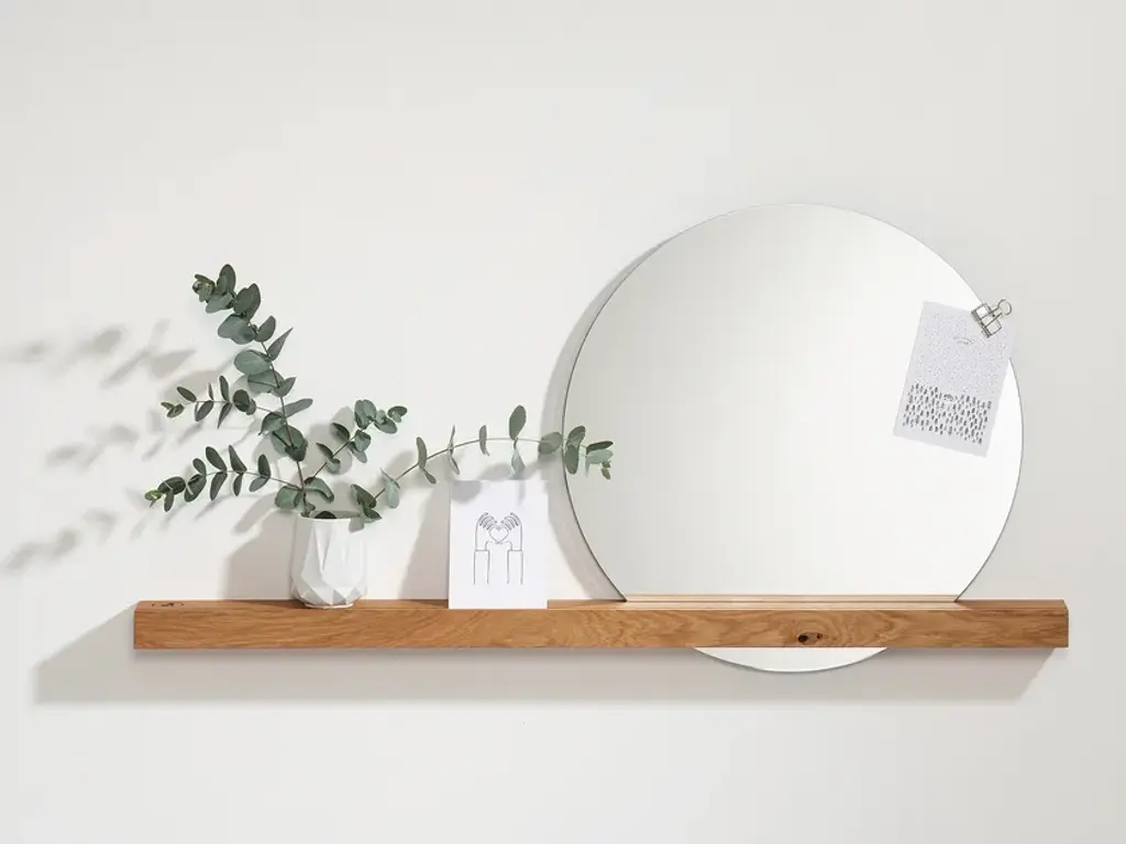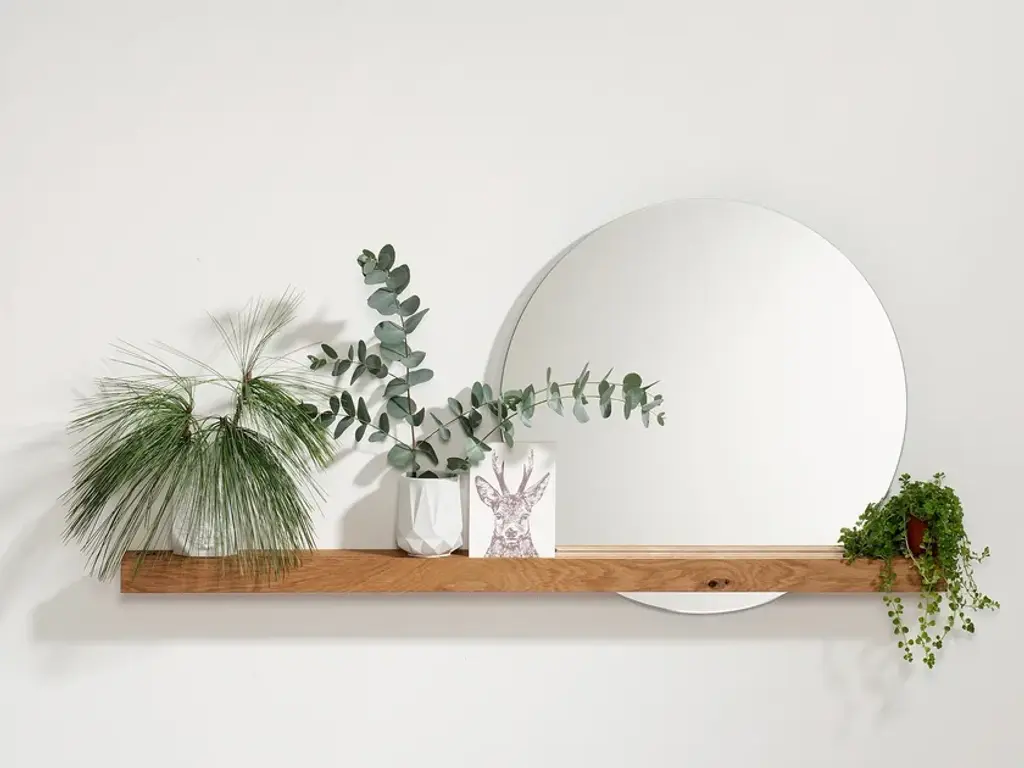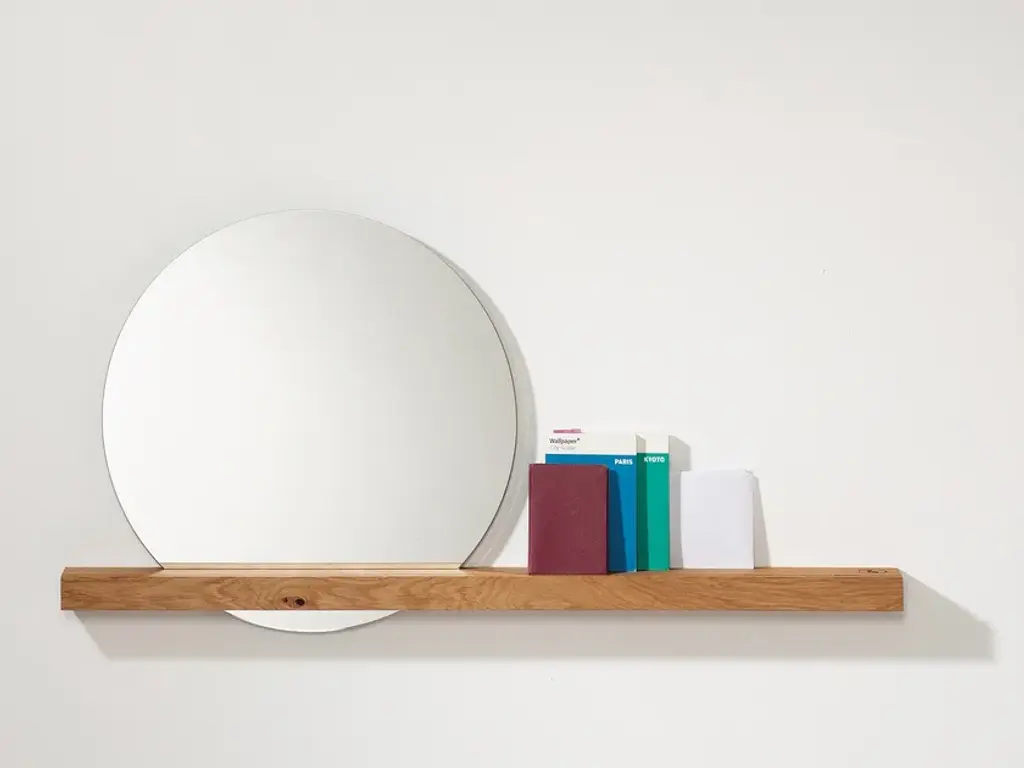 The Oak 01 Wall Mirror by weld & co combines a slim ledge of solid, oiled oak with a round mirror that almost appears to float. This effect is made possible by a slot in the shelf – the mirror and the opening are sized so the mirror is automatically held in place once inserted, resulting in a captivating mixture of form and function.The mirror and its wood shelf are perfect for use in the hall or entryway, or for adding a distinctive touch to your living space. A lengthwise groove in the shelf can be used to display photos, small prints, etc., transforming the Oak 01 Wall Mirror to a picture ledge that draws every eye. Depending on how it is placed, the mirror also enhances the room with depth and reflections.The mirror and its shelf can also play a starring role in your bedroom or dressing room – as a classic wall mirror, a handy shelf, and a decorative element that reflects and highlights objects from different angles. Our Oak 01 Wall Mirror is also an attractive and practical home accessory for your bathroom or powder room.The shelf of oak wood is 100 cm long and is mounted on the wall using two screws. The mirror has a diameter of 50 cm and is inserted in the slot provided for it.Material: Oiled oak, MirrorPurchase includes: Wall Mirror (Shelf, Mirror), mounting hardwareOak – hardly any other type of wood stands for so many positive qualities. Featuring warm golden tones and a distinctive grain, oak is a robust favorite for creating products that last. All of these characteristics can be found in the furniture and home accessories of the weld & co Oak collection. Elements made of powder-coated steel underscore the wood’s many charms, making the furniture and home accessories of the Oak collection into sturdy, unique, and timeless products.
