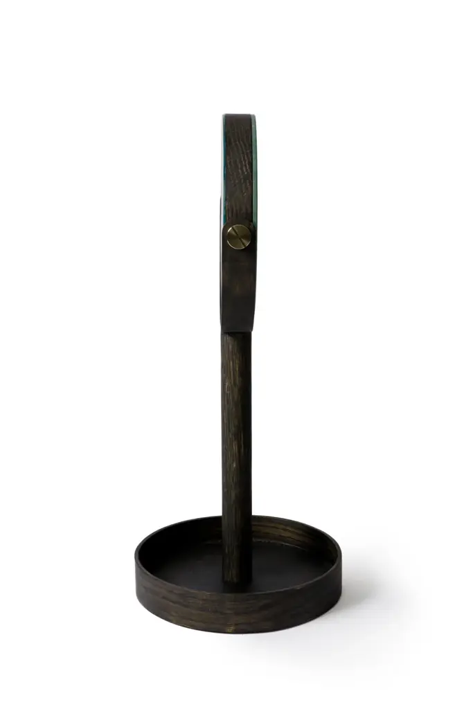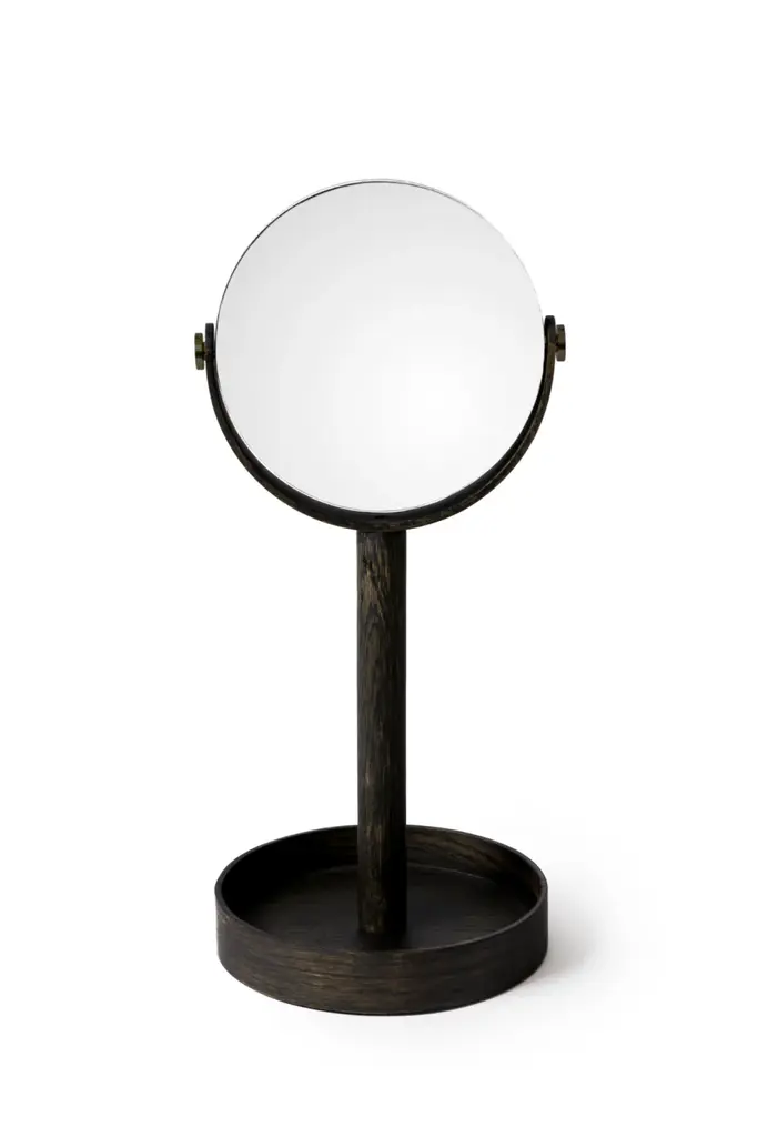 Close Up's pivoting magnifying mirror adjusts to the angle you desire. There's a choice of plain mirror on one side and a x5 magnification mirror on the other. The tall wood stand positions the mirror at a usable height; you won't have to hunch over. The round base is edged and can be used as a tray to hold your personal items like make-up, nail polish or contact lens cases, it's also very stable. Made from sustainably harvested natural American white oak and oak veneers, selected for their warm color, beautiful grain pattern and traditional hardwood durability. All edges look crisp but are carefully hand sanded to make them soft to the touch. Finished with a matt, water resistant lacquer. Silicone feet stop it slipping. Design by Lincoln Rivers.