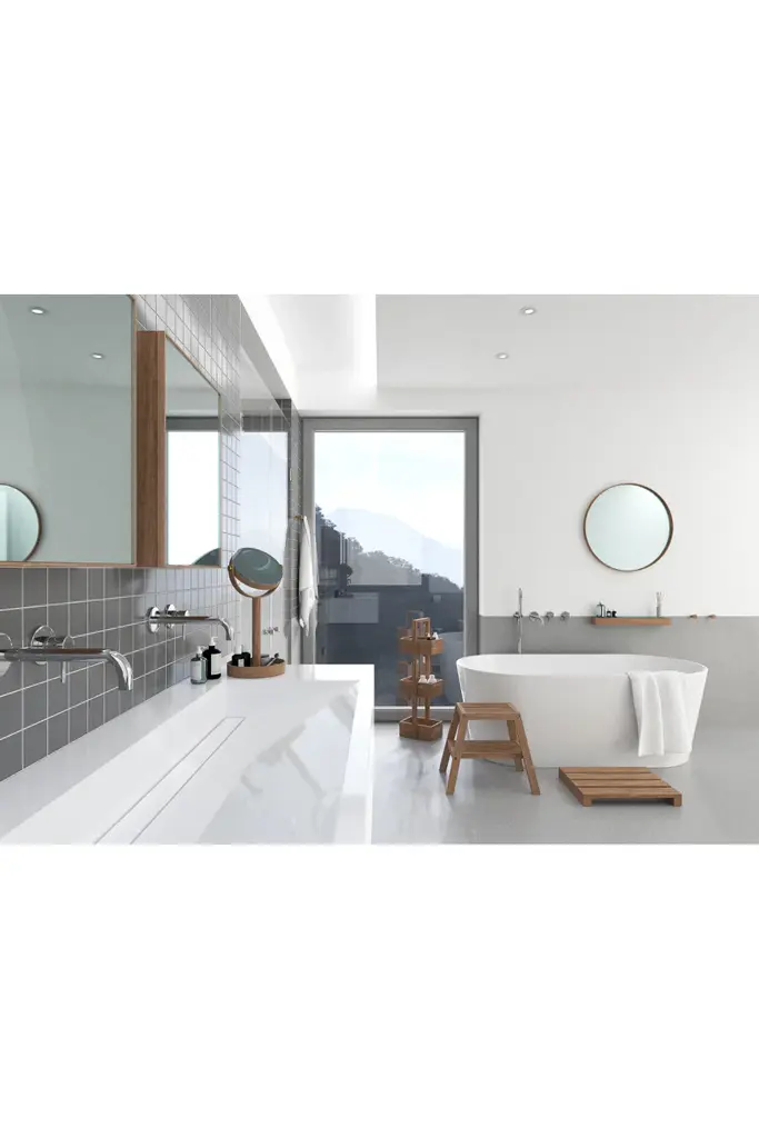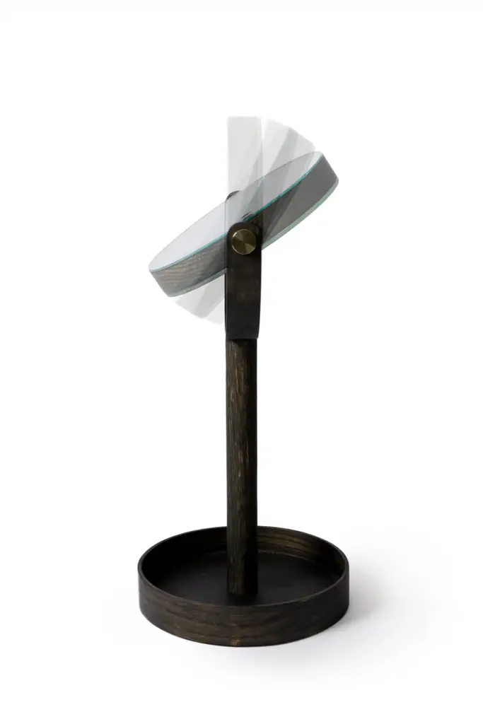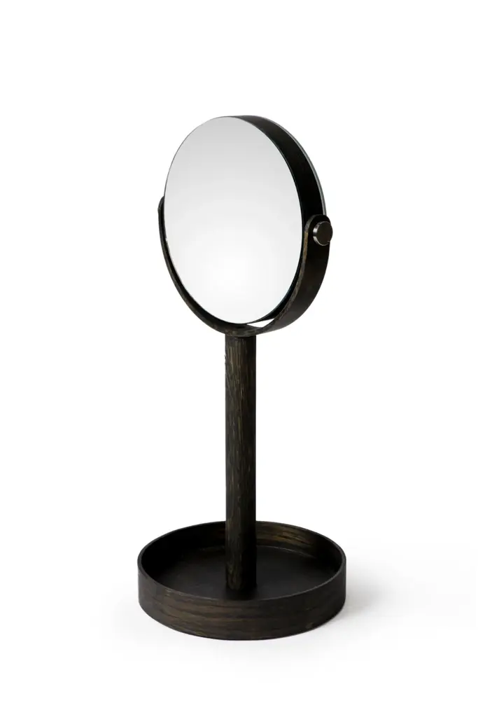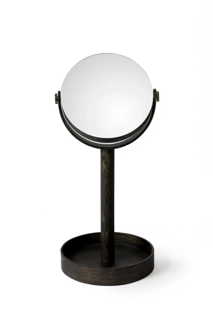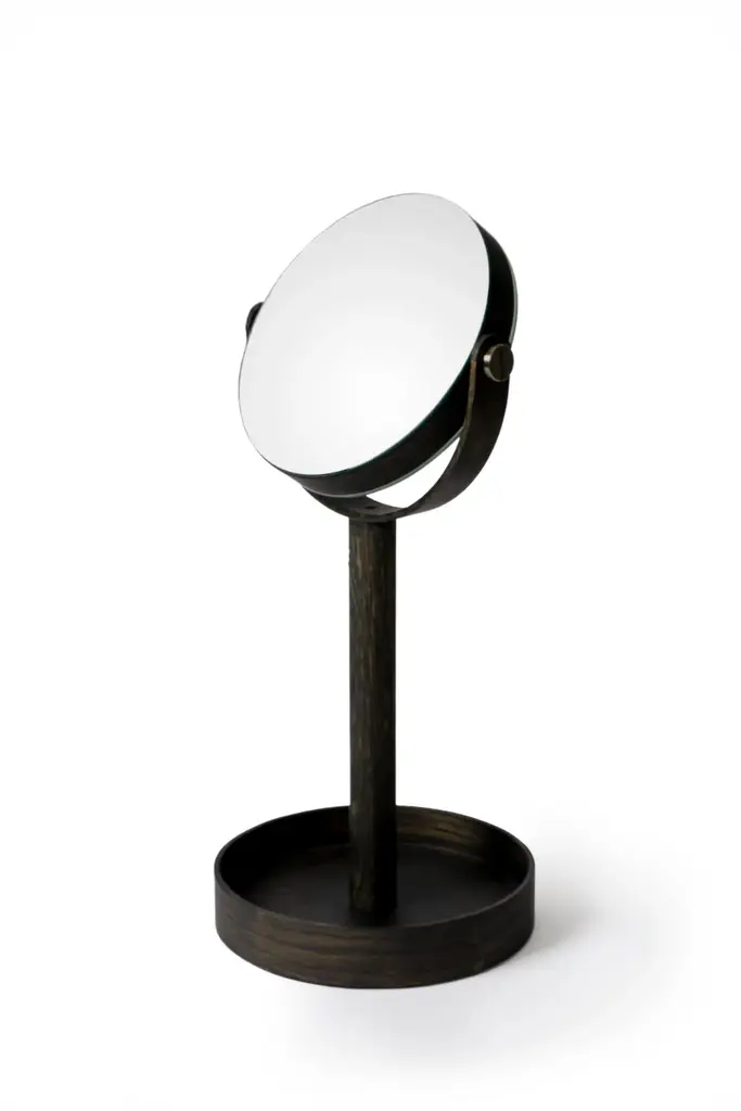 Close Up's pivoting magnifying mirror adjusts to the angle you desire. There's a choice of plain mirror on one side and a x5 magnification mirror on the other. The tall wood stand positions the mirror at a usable height; you won't have to hunch over. The round base is edged and can be used as a tray to hold your personal items like make-up, nail polish or contact lens cases, it's also very stable. Made from sustainably harvested natural American white oak and oak veneers, selected for their warm color, beautiful grain pattern and traditional hardwood durability. All edges look crisp but are carefully hand sanded to make them soft to the touch. Finished with a matt, water resistant lacquer. Silicone feet stop it slipping. Design by Lincoln Rivers.