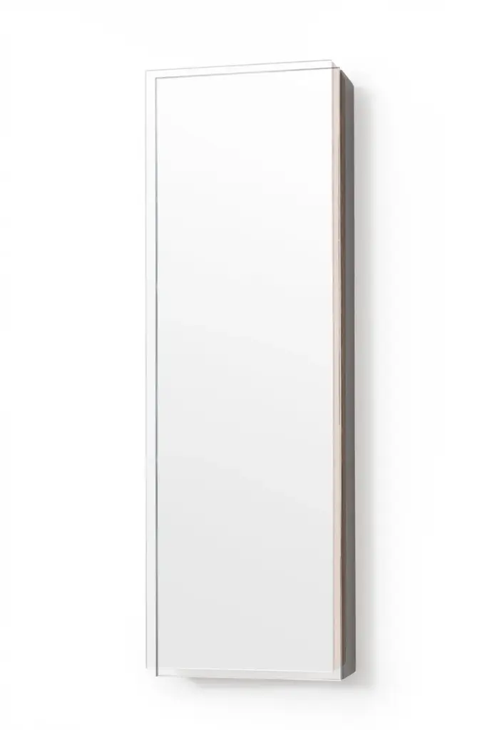 Zone 800 is a slim, vertical bath cabinet for those corners and walls where a more conventional size will not fit. The door front is a conventional polished edge mirror but mounted inside there’s a special times five magnification mirror to give a much bigger close up view. Extending hinges mean the door opens wider so no awkward positioning needed to use the magnifying mirror. The cabinet can be fixed for either left or right hand opening. A full edge rebate extends on three sides to make door opening easy. Inside there are three moveable, polished, tempered glass storage shelves. The oak cabinet is assembled with filet corner joints giving strength and rigidity. Made from sustainably harvested solid American white oak, finished in a smooth, matt, water resistant lacquer. Edges look crisp but are finely hand sanded to make them soft to the touch. Design by Lincoln Rivers.