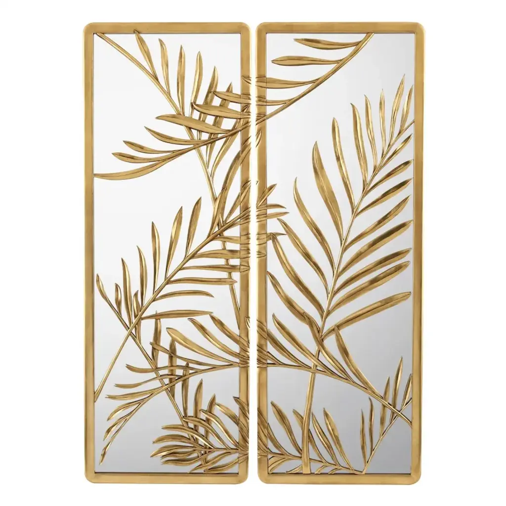 The Oasis Mirrors are stunning pieces that beautifully enhance a space through natural motifs. Rectangular beech wood frames with steel supports and a Gold Coast finish showcase overlapping fronds with intricate detailing. The mirrors are both affixed with French cleats and may only hang in a vertical orientation.