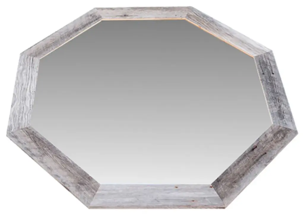 This is our brand new Octagon Barnwood Mirror. It''s a woodshop favorite, and there is no other like it. Designed by our Woodshop Foreman and part owner Mitch Giles himself. This mirror is made from authentic reclaimed barnwood and is sure to be a great conversation piece in your home or cabin. The Octagon mirror is 36" X36� from side to side. The frame of the mirror is 3� wide and has a low profile of only _ deep.Comes with D Ring hanging hardware. Each Mirror is unique and is made from true reclaimed wood. Mirrors are built to order. Quality craftsmanship guaranteed