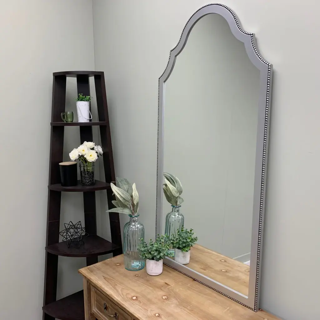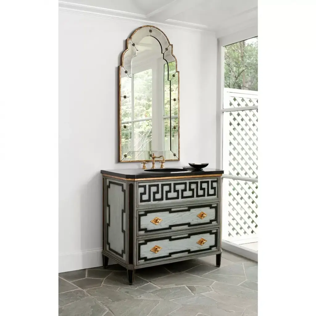 Large and impressive Octo Mirror has antique mirror frame with reverse carved bulls eye design. Interior clear mirror has 1'' bevel. Exterior fame is made of solid wood with a faux metal finish. Hangs on one metal cleat (provided).