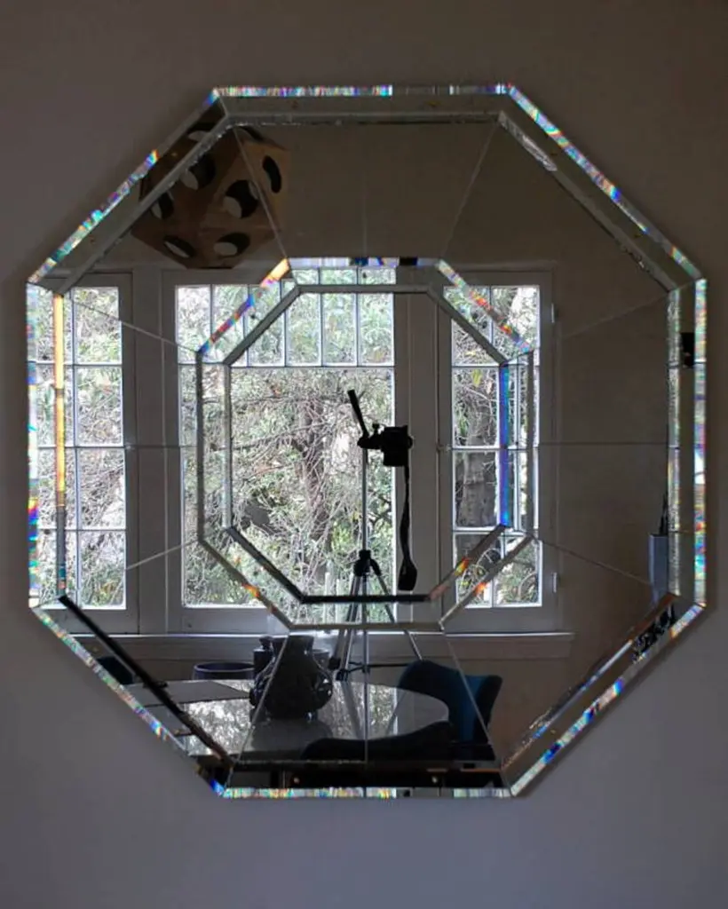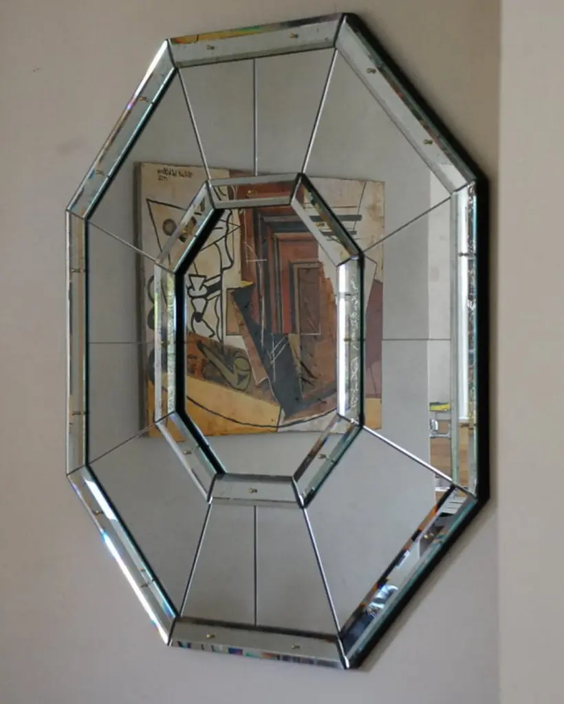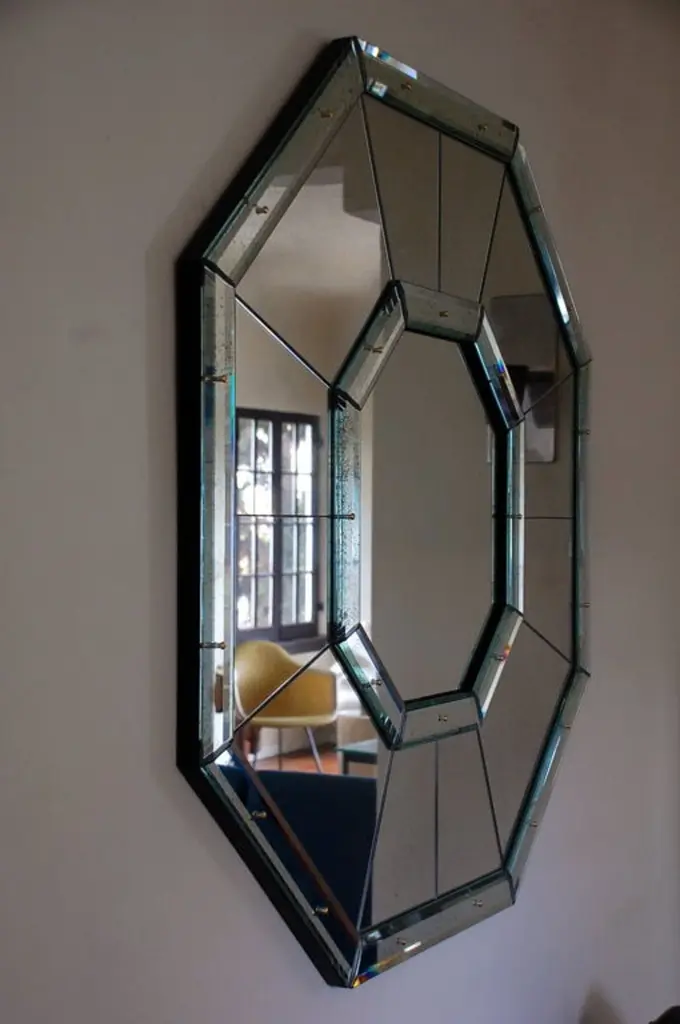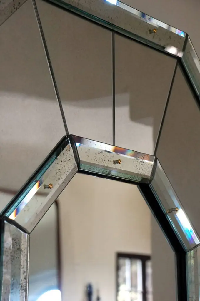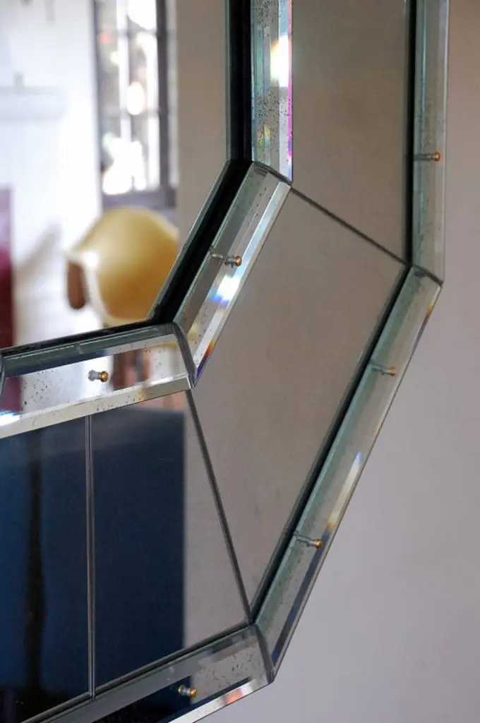 'Octogone' faceted mirror by Design Frères.A delicate geometric composition alternating clear and antiqued mirror panels framed by overlapping thick beveled mirror baguettes held in place by decorative solid brass screws.A modern take on an Art Deco Classic, all handmade in our Los Angeles atelier.The last image from a Paris apartment project by STUDIO KO, shows this type of mirror in situation.