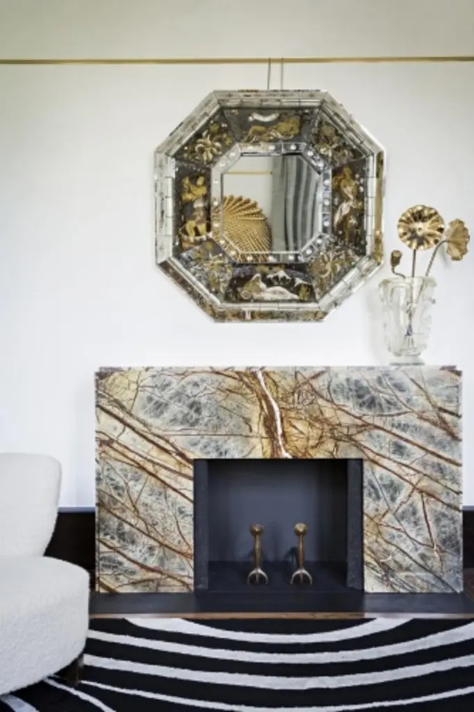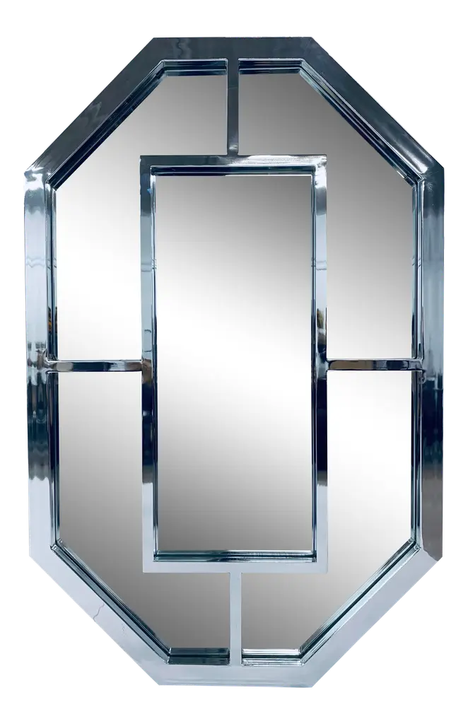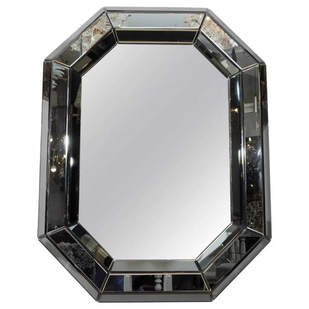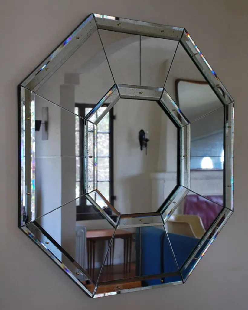 'Octogone' faceted mirror by Design Frères.A delicate geometric composition alternating clear and antiqued mirror panels framed by overlapping thick beveled mirror baguettes held in place by decorative solid brass screws.A modern take on an Art Deco Classic, all handmade in our Los Angeles atelier.The last image from a Paris apartment project by STUDIO KO, shows this type of mirror in situation.