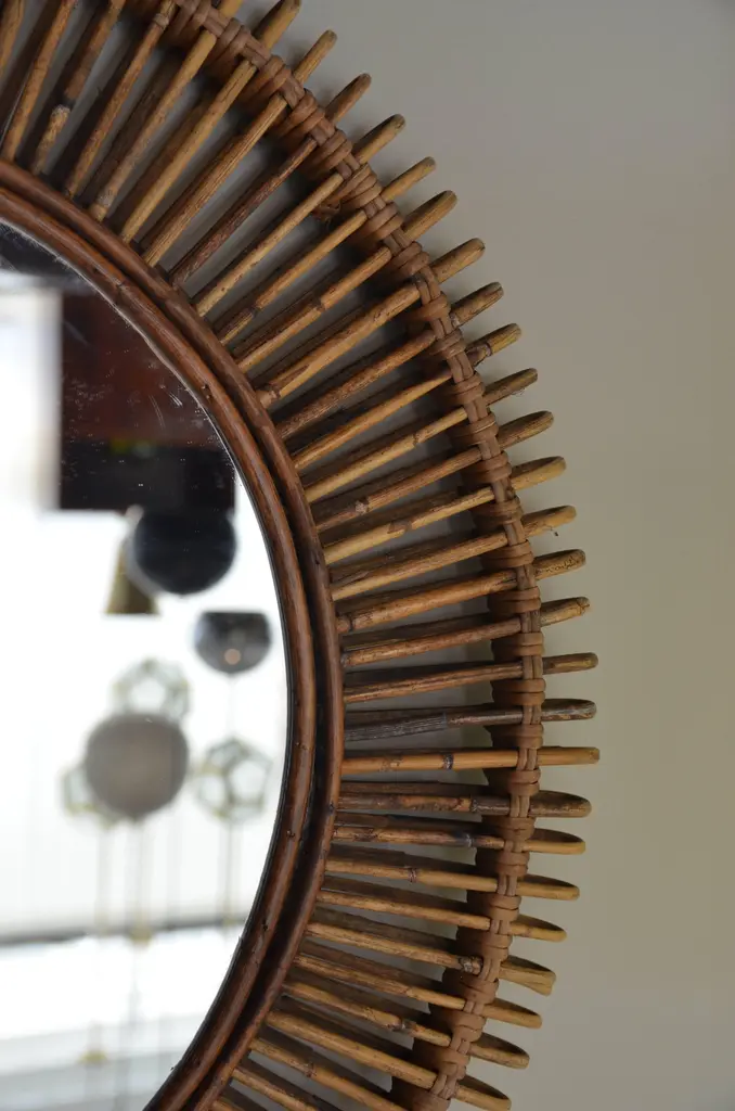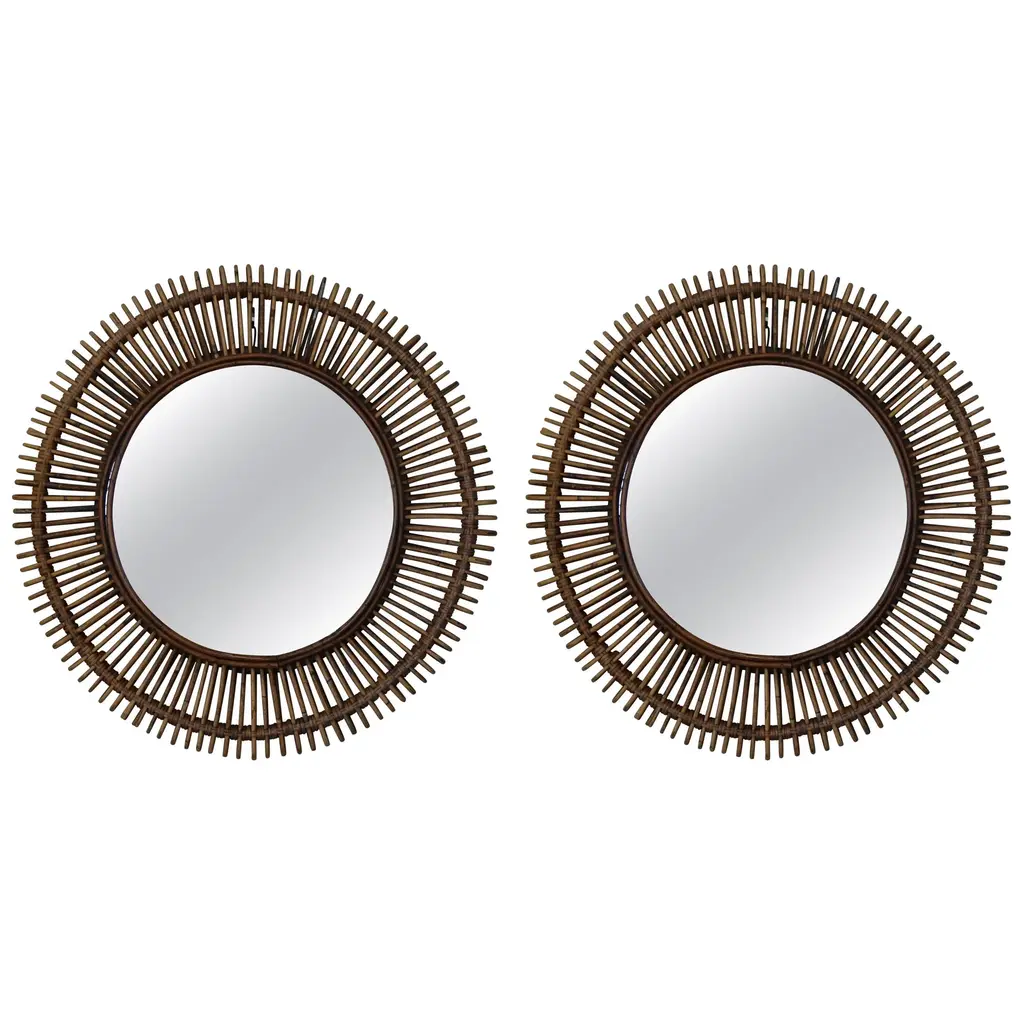 Pair of 'Oculus' round rattan mirrors by design Frères. Flat mirror inserted into an intricate rattan frame. Available Now