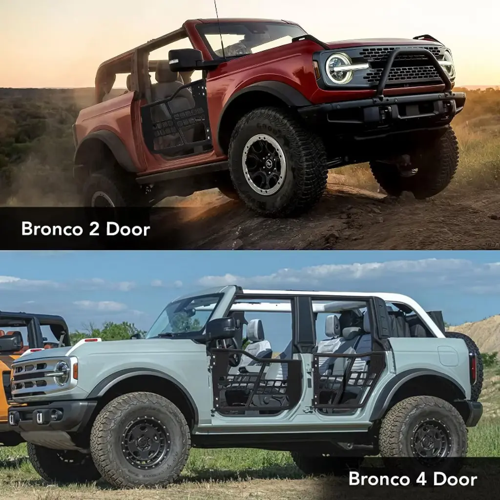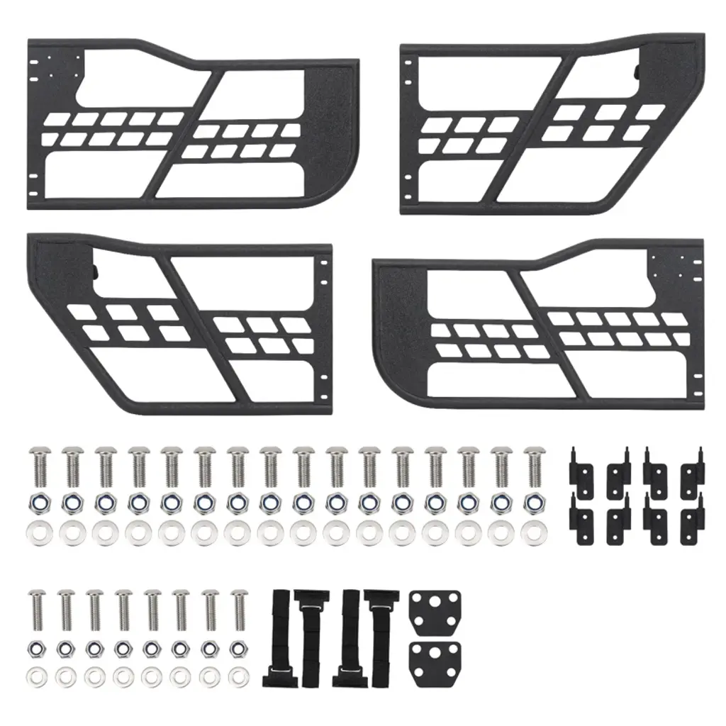 Tubular Doors for Ford Bronco & Jeep Wrangler - Universal Off-Road Alloy Steel Construction[Universal Vehicle Compatibility] These versatile tubular doors are engineered to fit a wide range of popular off-road vehicles. They are specifically compatible with the 2021-2025 Ford Bronco 4-Door models, the 2007-2018 Jeep Wrangler JK, and the 2018-2025 Jeep Wrangler JL. This universal fitment provides a flexible solution for off-road enthusiasts with different vehicles.[Robust Alloy Steel Construction] Built for toughness and longevity, these doors are fabricated from heavy-duty 1/8-inch thick alloy steel. The exterior is finished with a durable metallic coating applied through a premium E-coating process, significantly enhancing resistance to corrosion, scratches, and the elements for reliable performance on any trail.[Unobstructed Open-Air Adventure] Transform your vehicle for an authentic open-air driving experience. The tubular design dramatically improves your field of vision and connection to the outdoors, while adding a rugged, stylish profile to your Bronco or Wrangler. Please note: side view mirrors are not included with these doors.[Simple No-Drill Installation] Designed for ultimate convenience, these doors feature a direct bolt-on installation that requires no drilling or permanent modification. They are engineered to mount seamlessly onto the original equipment (OE) door hinges and include clear instructions for easy on-and-off switching in minutes.[Strictly for Off-Road Use] This product is designed exclusively for off-road and recreational use. It is not a certified safety device and does not provide side-impact protection. It is imperative to always wear your seat belt and avoid sharp turns or sudden maneuvers. For maintenance, regularly inspect the coating and store in a dry place to preserve the finish.