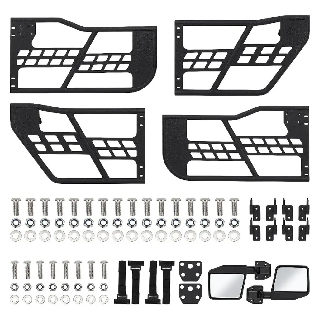 Wrangler JL/JLU 4-Door Tube Door Set - Off-Road Steel Construction with Mirrors[Vehicle-Specific Precision Fit]Engineered exclusively for 2018-2025 Jeep Wrangler JL 4-Door models, this complete set includes four half tube doors that provide perfect alignment and seamless integration. Features direct bolt-on installation using factory OE hinges without requiring drilling or modifications, ensuring quick and hassle-free setup for immediate off-road adventures.[Premium Durable Steel Construction]Crafted from heavy-duty 1/8-inch thick steel with advanced E-coating finish for superior protection against rust, UV damage, corrosion, and trail scratches. The robust construction maintains structural integrity through demanding off-road conditions while preserving the rugged aesthetic appeal of your Wrangler.[Enhanced Visibility & Airflow System]Incorporates high-strength mesh panels that maximize ventilation and provide unobstructed sightlines during off-road exploration. The mesh design effectively blocks debris and dirt while allowing optimal airflow, creating an authentic open-air driving experience with improved environmental awareness.[Complete Adventure-Ready Package]Includes four full-size tubular doors (front and rear) along with two side view mirrors for maintained driving visibility and compliance. The comprehensive accessory kit contains all necessary hardware for complete installation, making this a turnkey solution for off-road enthusiasts seeking open-air freedom.[Off-Road Safety & Usage Advisory]Designed specifically for off-road and recreational use only. These tubular doors do not provide side-impact protection and should not be considered safety restraint devices. Always wear seat belts, avoid aggressive driving maneuvers, and inspect hardware regularly to ensure secure mounting during off-road adventures.