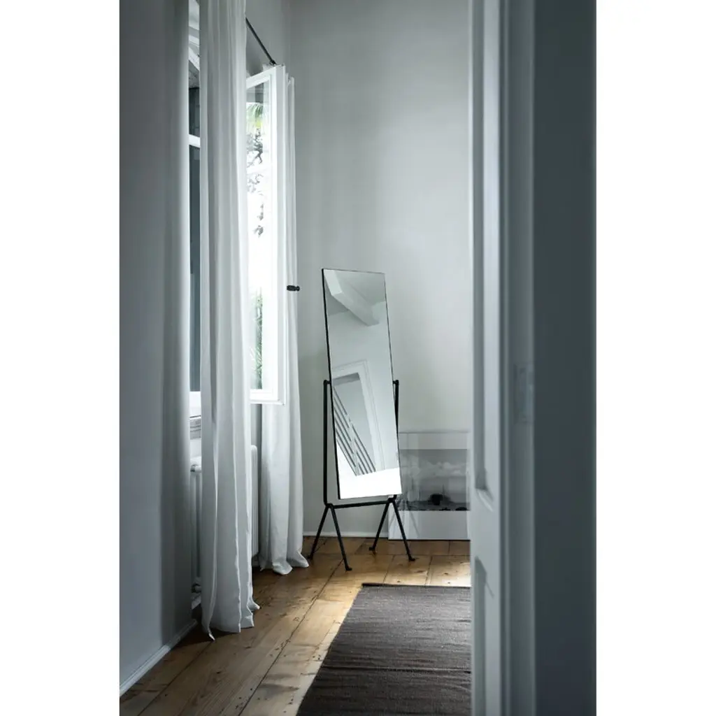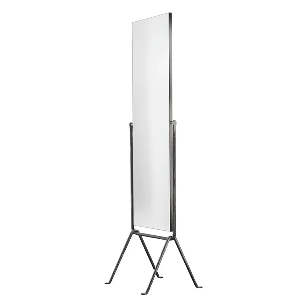 The Officina mirror by Ronan and Erwan Bouroullec is part of Magis' collection consisting of simple, elegant furniture with wrought iron legs. The Bouroullec brothers wanted to utilize the traditional forging technique in contemporary design and dreamed up a minimalist iron base featuring a raw finish with unique tool marks. The slender but sturdy iron legs have been galvanized and combined with a frameless mirror to create a sophisticated appearance. The mirror is double-sided.