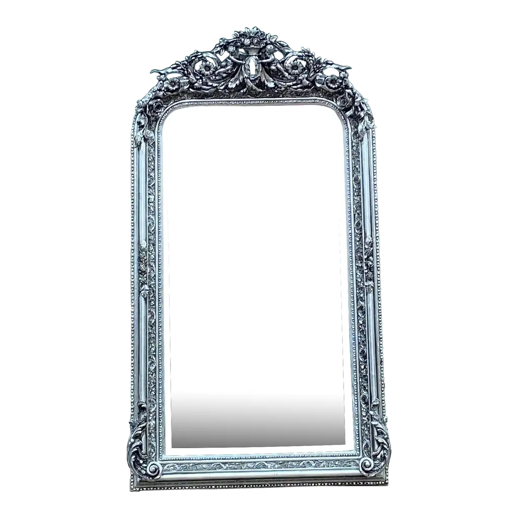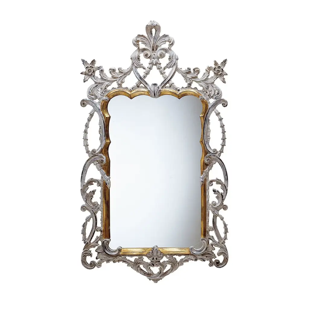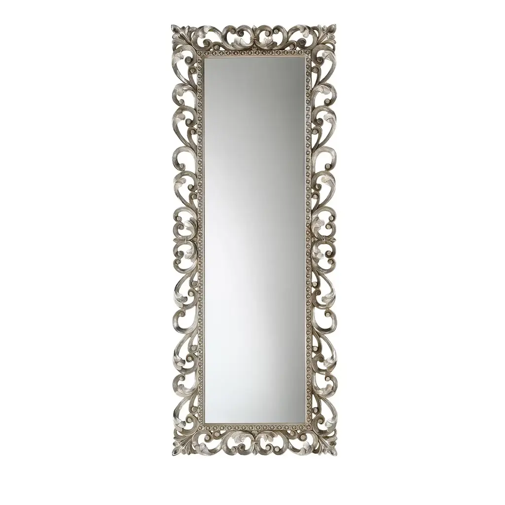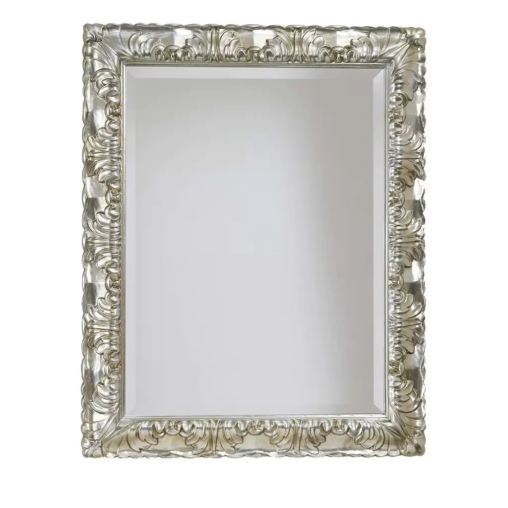 OLIVER - Wooden frame hand carved - antique silver finish.Handcarved mirrors. Numerous shapes (round, square, rectangular, oval,…) and designs available (retro, contemporary, modern,…). Exist in several sizes and many different finishing and colours.