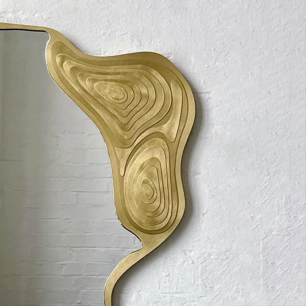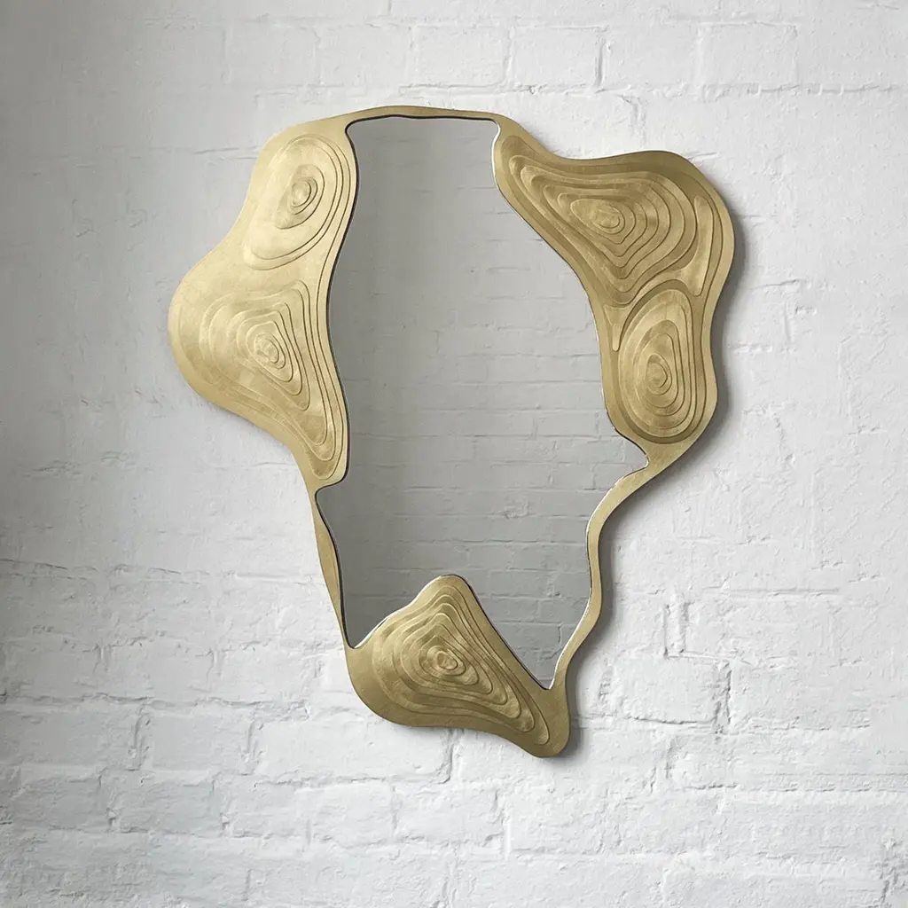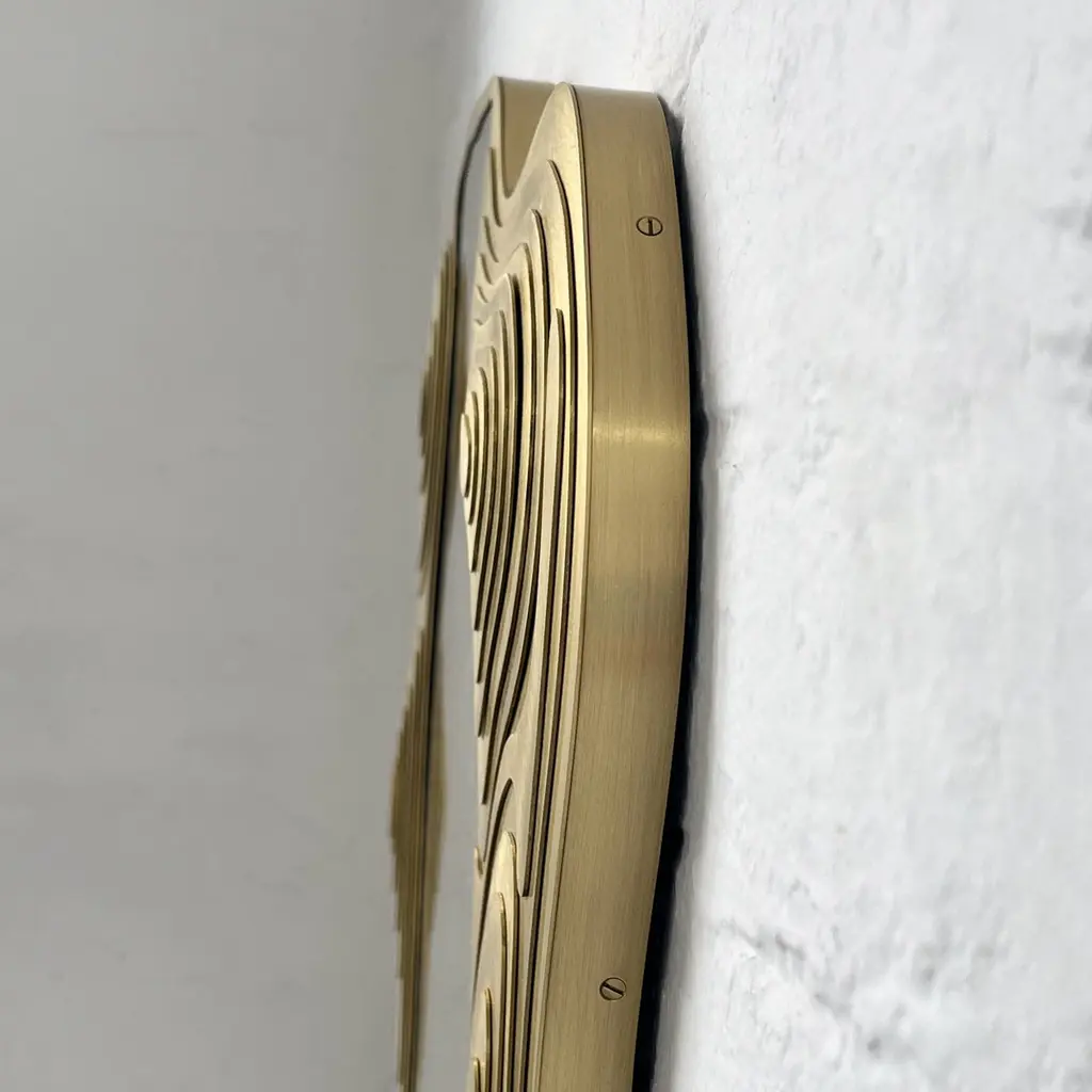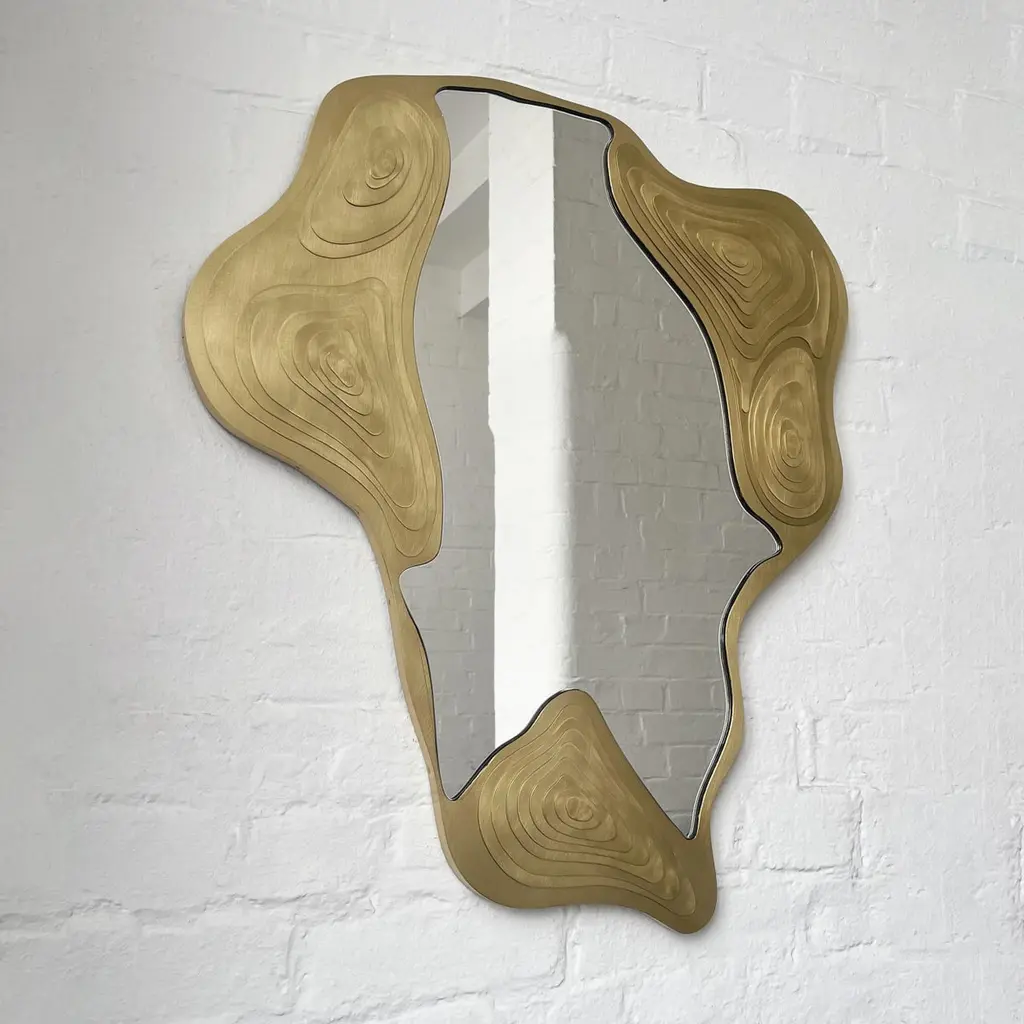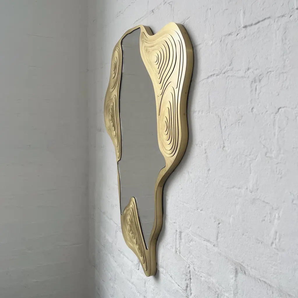 Omalo™ Special Edition Mirror with a Delicately Handcrafted Brass Frame. This original creation was inspired by the stunning mountains of the Busheti region in Georgia. Designed and handcrafted in London, UK. Shipped worldwide.Constructed with multi layers of solid brushed brass, its free form adds movement and depth to the piece that becomes a symbol of a natural mountainous scenery surrounding a peaceful lake or a deep valley.The piece is finished with apparent screws emphasising the organic and crafty design. Ideal for all design and nature lovers.Dimensions (customisable):80 cm High x 68 cm Wide x 2.4 cm Deep / 31.5 in x 27 in x 0.94 inShipped safely and insured worldwide. All our mirrors are made on demand. Fabrication lead time for this mirror is approximately 5-6 weeks. Our mirrors are always shipped by courier express. Shipping via courier express typically requires 1 to 2 days to the UK, or 2 to 7 days outside the UK depending on the destination.ORDERS OF MULTIPLE MIRRORS OF THE SAME TYPE: Please contact us to receive a Packing and Shipping quote when ordering multiple mirrors of the same type. An order for multiple mirrors of the same type may not be accepted without extra packing and shipping fees. Thank you.