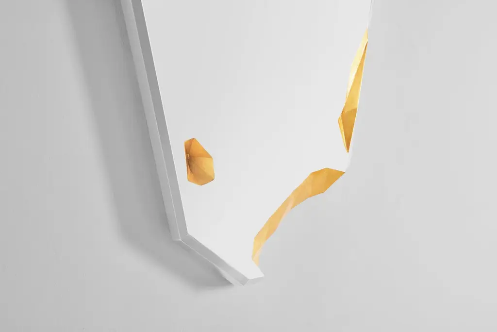 Size and color is customizable upon request, lead time is 30-60 days. We ship internationally.Through Atelier Mark Sturkenboom, he has formulated a mineral-based fluid which, through a gradual process of accretion, precipitates the growth of crystals on various types of objects. As part of the Overgrown series, “Once Upon A Time” is a collection of diamond-shaped mirrors that are overgrown with natural minerals. The mirrors portray a fading self reflection and allude to a changing state of transience in time and identity.