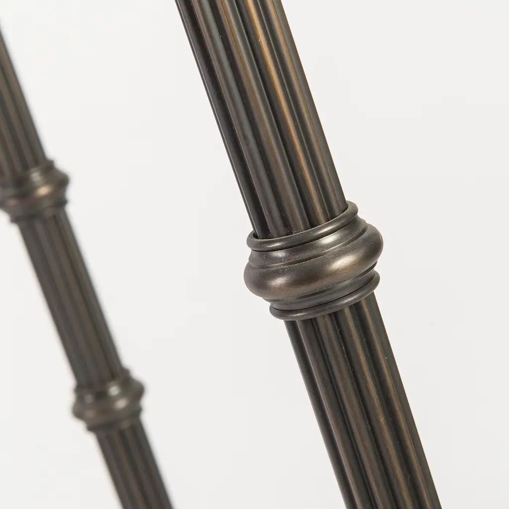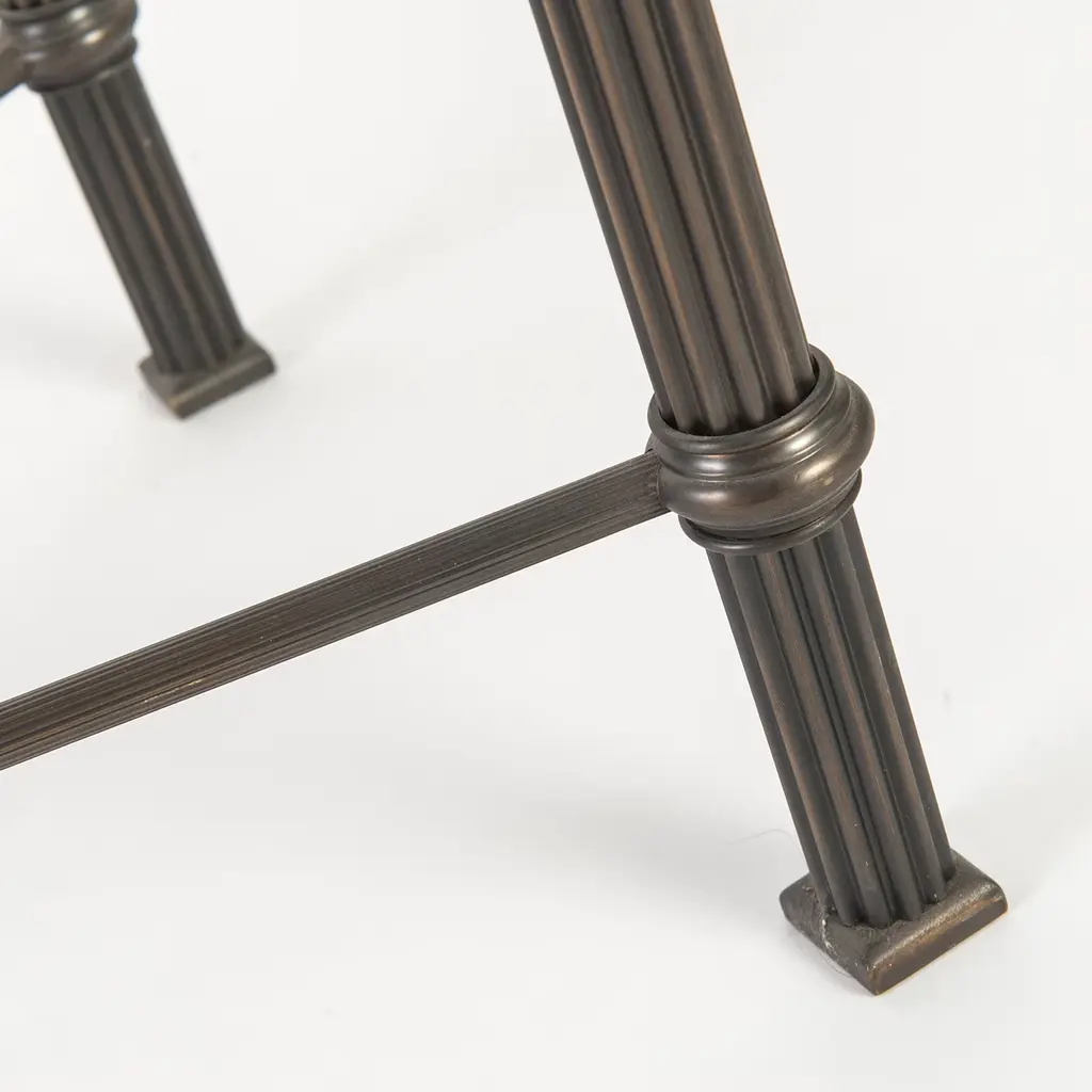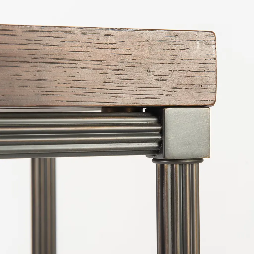 The "Onde" console is a captivating piece of contemporary furniture. Its frame is crafted from dark burnished ribbed brass, creating a dynamic, rippling effect. The solid oak top features an antique mirror insert, adding a touch of elegance and depth.