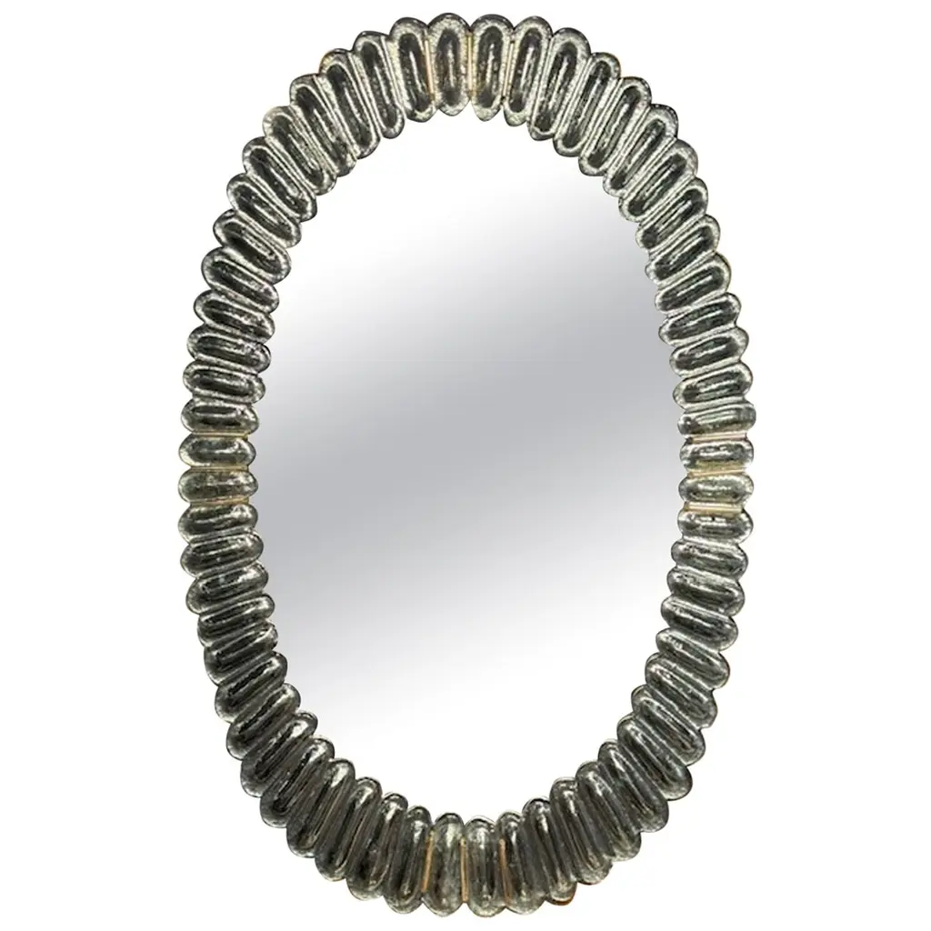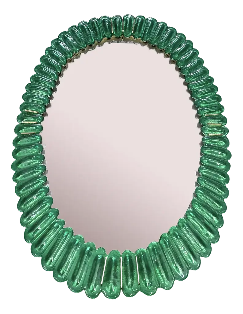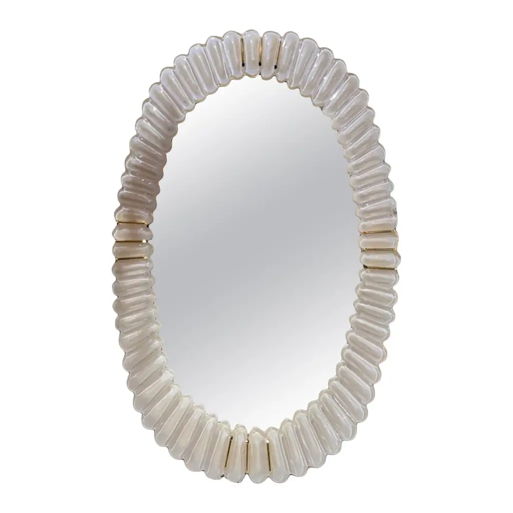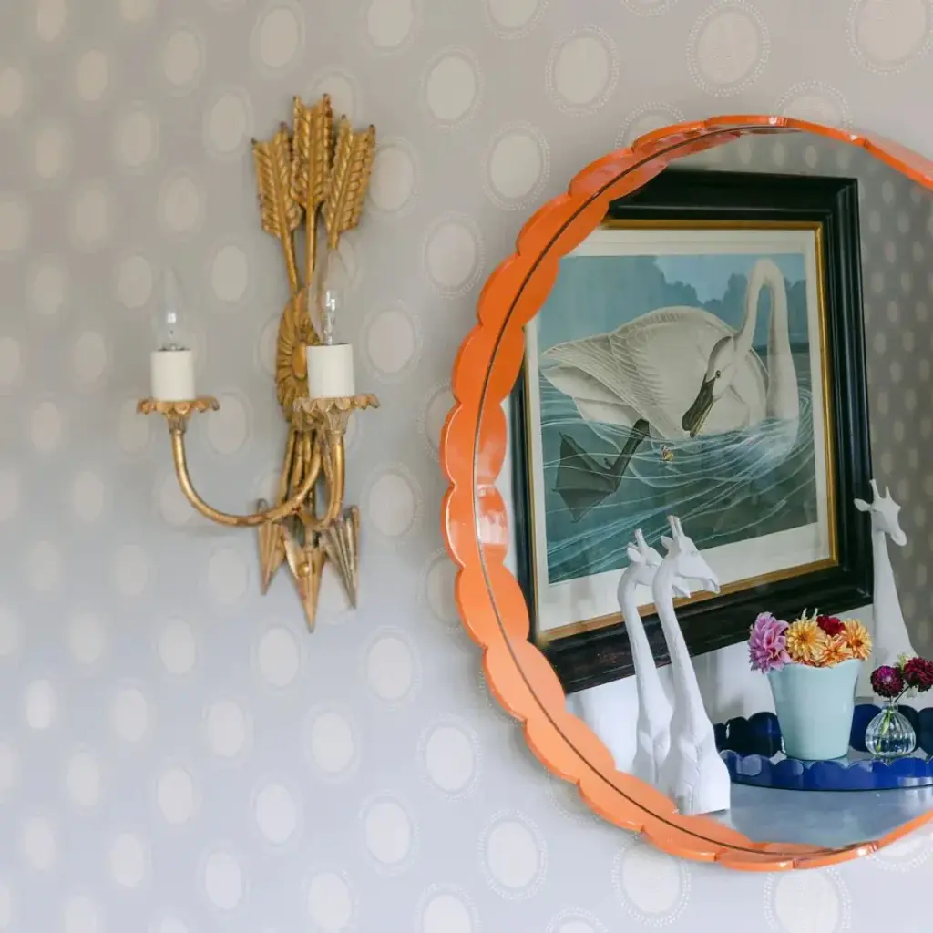 A beautifully finished orange scallop edged wall hanging mirror, featuring 20 coats of lacquer, hand polished between each coat. The mirror is recessed within the scallop edge to create a slightly 3 D reflection of the scallop within the frame.