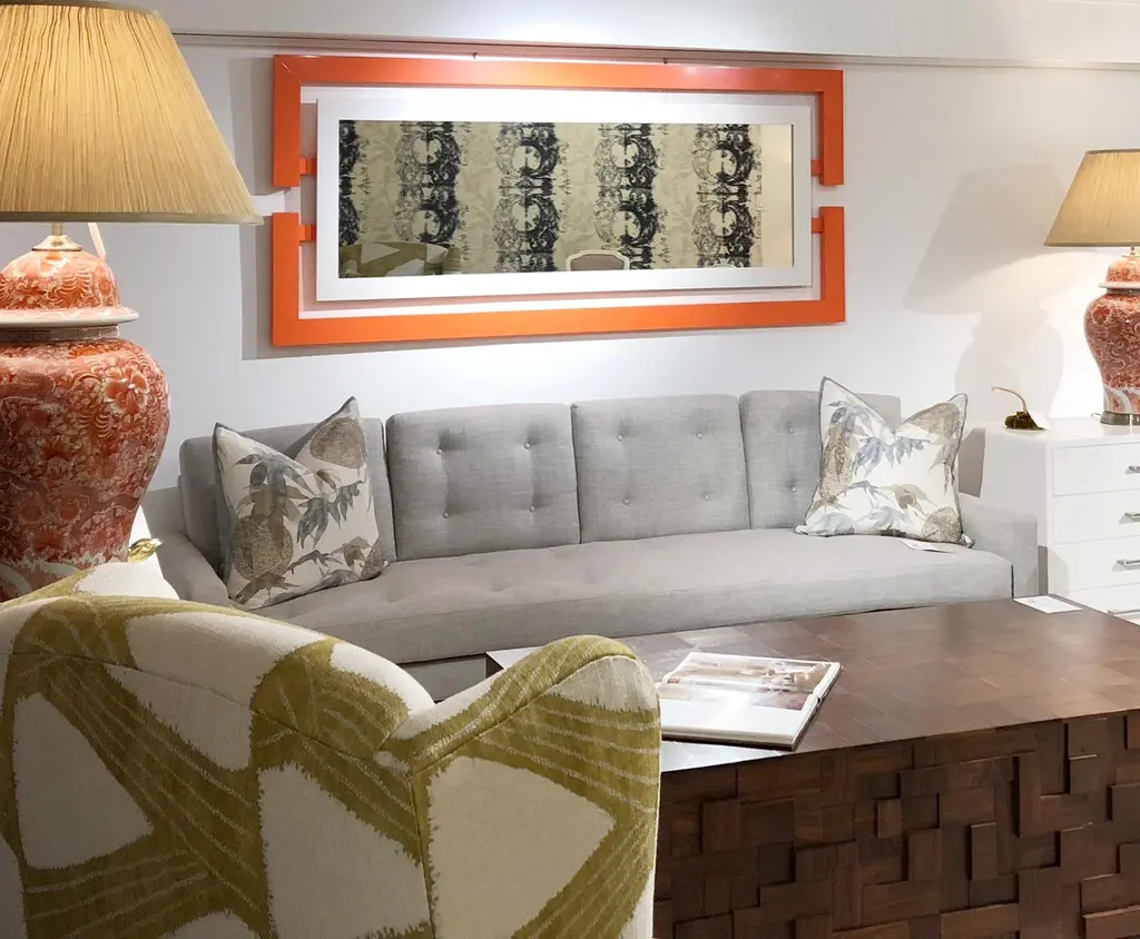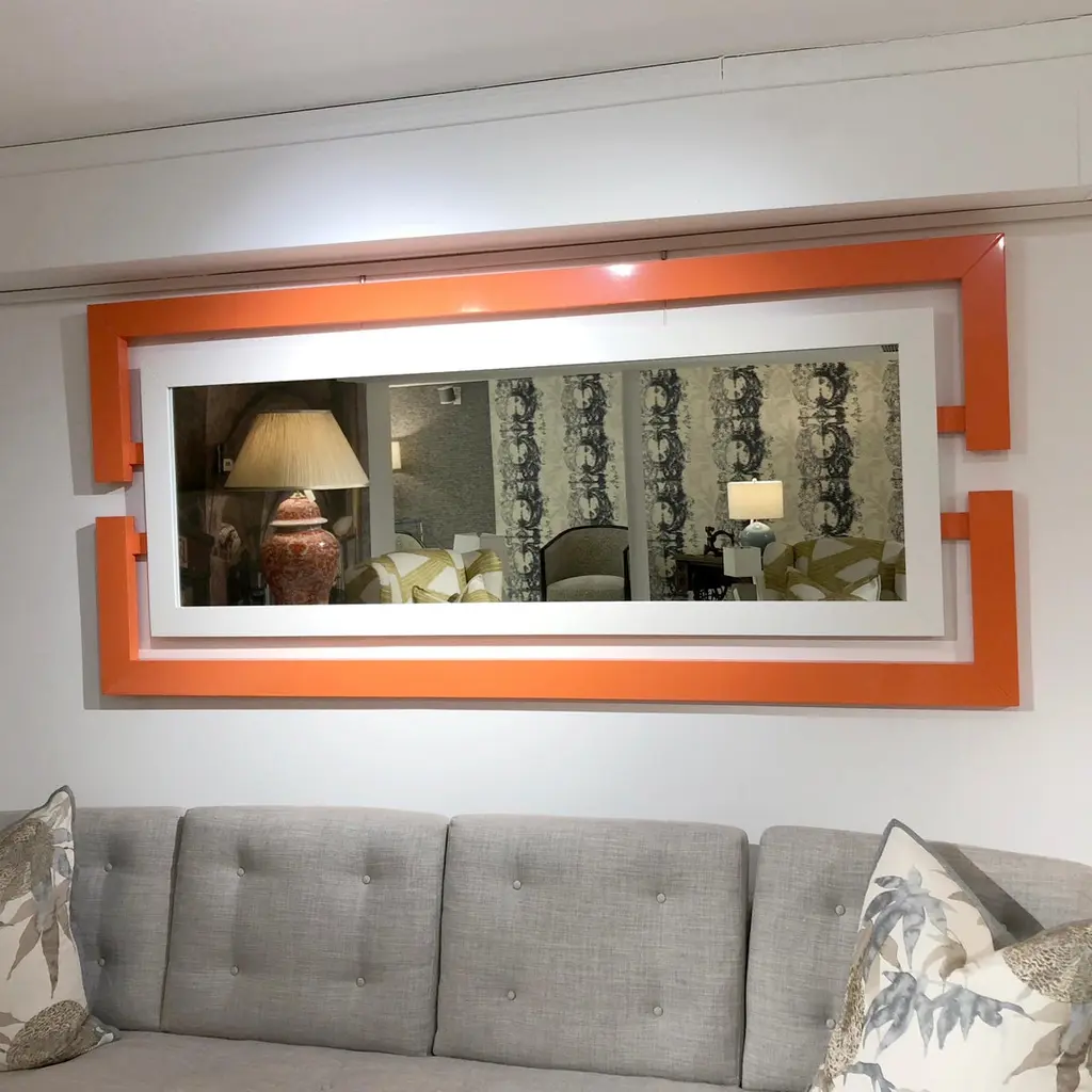 Inspired by the Space Age, this modern rectangle wall mirror lacquered in a matte orange can be bought as shown or customized to your liking. Handcrafted in our studio in Norwalk, Connecticut. Measurements: 34" H x 76" W.
