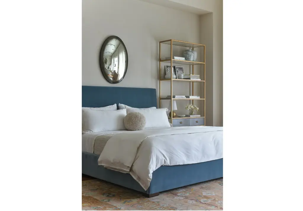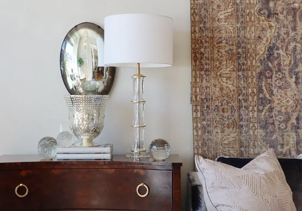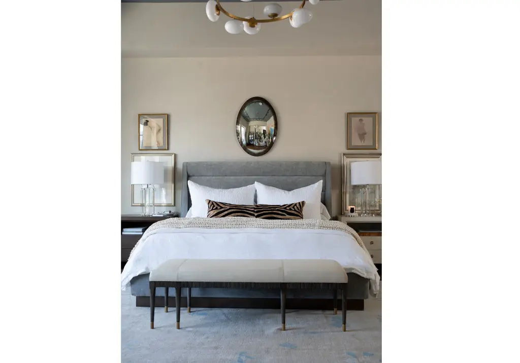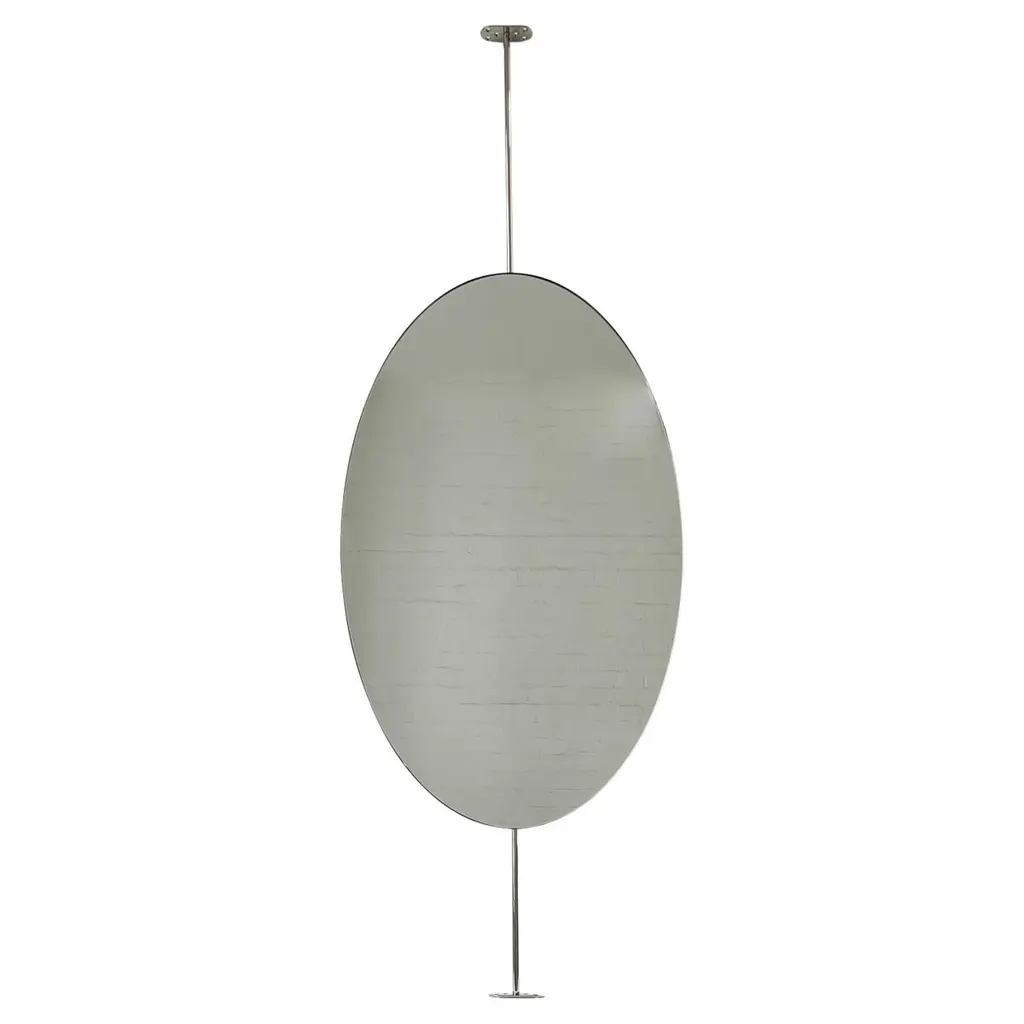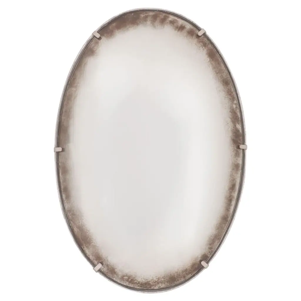 This exceptional mirror lends a cultured and sophisticated style with its elongated orb shape accentuated by an antiqued edge. A simple iron frame with paralleled accents provides an additional tasteful touch.