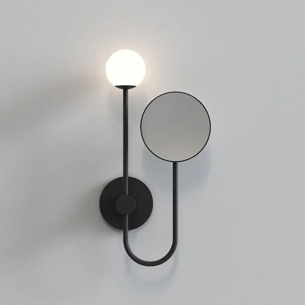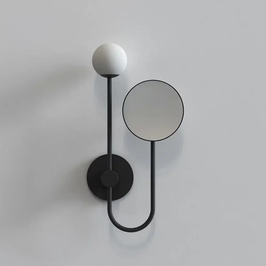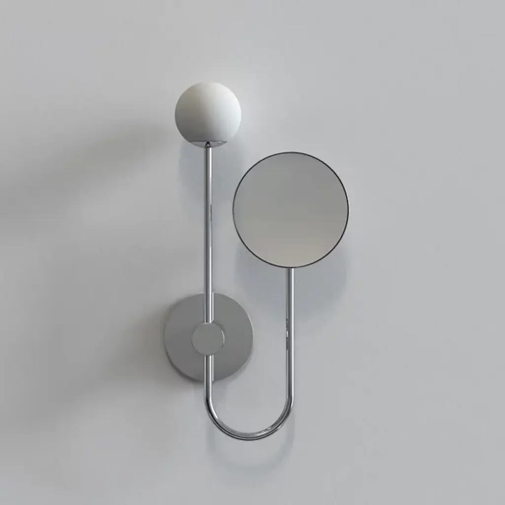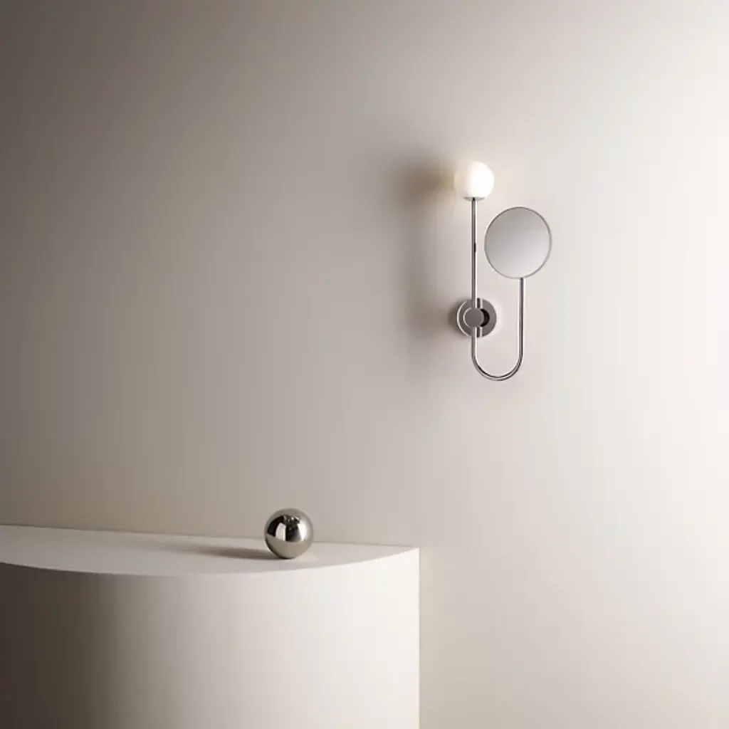 Add a unique, functional piece to the décor of your home with the Orb Wall Sconce with Mirror, one of the pieces of the Capsule Collection Volume 01 by Astro Lighting. This piece is made of smooth metal throughout and starts with a round base that connects directly to the wall. A long and slender arm gently curves into a U-shape, leading upward at both ends to an acid-etched glass orb and a crisp mirror. The LED within the orb provides a bright and even glow, while the fully adjustable mirror that 'orbits' around the lamp.