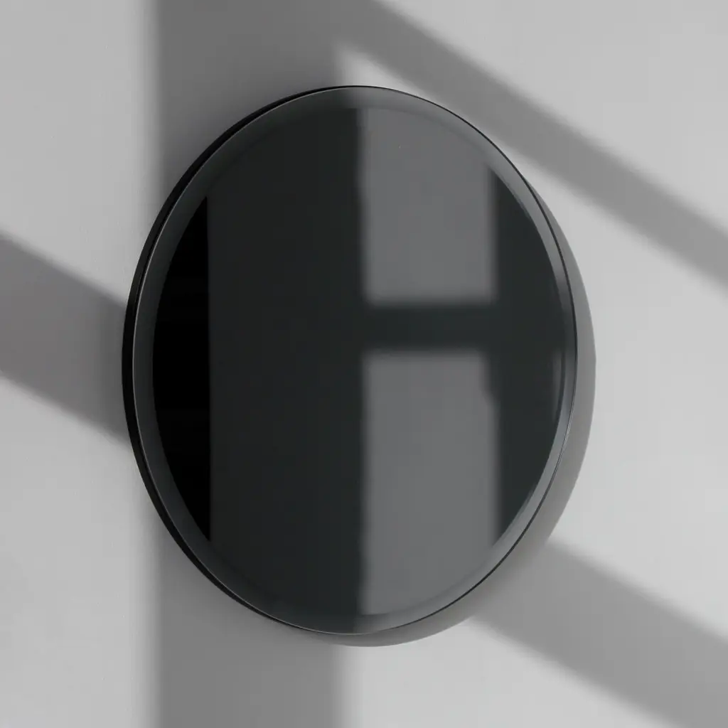 Art Deco style Orbis™ black tinted frameless mirror with an elegant bevel and a black faux leather backing. Designed and handcrafted in London, UK.Our mirrors are designed with an integrated French cleat (split batten) system that ensures the mirror is securely mounted flush with the wall. An alternative hanging hook or a Z-bar (depending on the size of the mirror) is available on demand for mirrors that need to be installed allowing some separation from the wall.Shipped safely and insured worldwide. All our mirrors are made on demand. Fabrication lead time for this particular mirror is approximately 4 to 5 weeks. Our mirrors are always shipped by courier express. Shipping via courier express typically requires 1 to 2 days to the UK, or 2 to 7 days outside the UK depending on the destination.Available in the following diameters:Small: 40cm / 15.8"Regular: 50cm / 19.7"Medium: 60cm / 23.6"Large: 80cm / 31.5"Extra Large: 100cm / 39.4"Depth 6mm / 0.24"Prices for 120cm / 47.2”, 150cm / 59”, or any bespoke diameter, are available on demand.Available options:- mirror tints: standard silver, black, bronze, blue, rose gold / peach- back-illumination creating a halo effect- front-illumination around the periphery of the mirror- demister padPlease contact us for a quote for any bespoke specification or added options.This mirror is fully customisable. Shipped safely and insured worldwide.ORDERS OF MULTIPLE MIRRORS OF THE SAME TYPE: Please contact us to receive a Packing and Shipping quote when ordering multiple mirrors of the same type. An order for multiple mirrors of the same type may not be accepted without extra packing and shipping fees. Thank you.