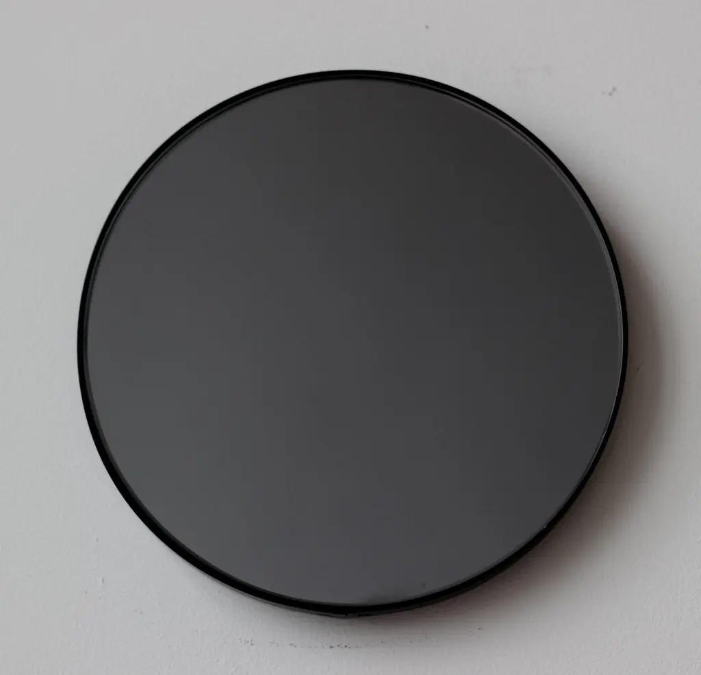 Contemporary Orbis™ round black tinted mirror with a minimalist aluminium powder coated black frame. Designed and handcrafted in London, UK.Our mirrors are designed with an integrated French cleat (split batten) system that ensures the mirror is securely mounted flush with the wall. An alternative hanging hook or a Z-bar (depending on the size of the mirror) is available on demand for mirrors that need to be installed allowing some separation from the wall.This mirror is fully customisable.Shipped safely and insured worldwide. All our mirrors are made on demand. Fabrication lead time for this particular mirror is approximately 4 to 5 weeks. Our mirrors are always shipped by courier express. Shipping via courier express typically requires 1 to 2 days to the UK, or 2 to 7 days outside the UK depending on the destination. Available in the following diameters and variations:Small: 40cm / 15.8"Regular: 50cm / 19.7"Medium: 60cm / 23.6"Large: 80cm / 31.5"Extra Large: 100cm / 39.4"Depth 1.8cm / 0.7" (customisable)Prices for 120cm / 47.2”, 150cm / 59”, or any bespoke diameter, are available on demand.Available options:- frame depth: 18mm / 0.71’’, 24mm / 0.94’’, and 30mm / 1.18’’- frame finish: brass (brushed, polished or with a bronze patina), copper, stainless steel, blackened metal, powder coated aluminium in a range of standard or bespoke colours- mirror tint: standard silver, black, bronze, blue, rose gold / peach- back-illumination creating a halo effect- front-illumination around the periphery of the mirror- demister pad- bevelPlease contact us for a quote for any bespoke specifications or added options.ORDERS OF MULTIPLE MIRRORS OF THE SAME TYPE: Please contact us to receive a Packing and Shipping quote when ordering multiple mirrors of the same type. An order for multiple mirrors of the same type may not be accepted without extra packing and shipping fees.