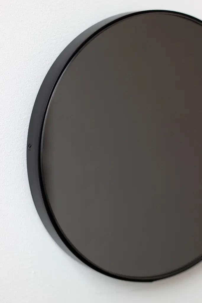 Contemporary Orbis™ round black tinted mirror with a minimalist aluminium powder coated black frame. Designed and handcrafted in London, UK.Our mirrors are designed with an integrated French cleat (split batten) system that ensures the mirror is securely mounted flush with the wall. An alternative hanging hook or a Z-bar (depending on the size of the mirror) is available on demand for mirrors that need to be installed allowing some separation from the wall.This mirror is fully customisable.Shipped safely and insured worldwide. All our mirrors are made on demand. Fabrication lead time for this particular mirror is approximately 4 to 5 weeks. Our mirrors are always shipped by courier express. Shipping via courier express typically requires 1 to 2 days to the UK, or 2 to 7 days outside the UK depending on the destination. Available in the following diameters and variations:Small: 40cm / 15.8"Regular: 50cm / 19.7"Medium: 60cm / 23.6"Large: 80cm / 31.5"Extra Large: 100cm / 39.4"Depth 1.8cm / 0.7" (customisable)Prices for 120cm / 47.2”, 150cm / 59”, or any bespoke diameter, are available on demand.Available options:- frame depth: 18mm / 0.71’’, 24mm / 0.94’’, and 30mm / 1.18’’- frame finish: brass (brushed, polished or with a bronze patina), copper, stainless steel, blackened metal, powder coated aluminium in a range of standard or bespoke colours- mirror tint: standard silver, black, bronze, blue, rose gold / peach- back-illumination creating a halo effect- front-illumination around the periphery of the mirror- demister pad- bevelPlease contact us for a quote for any bespoke specifications or added options.ORDERS OF MULTIPLE MIRRORS OF THE SAME TYPE: Please contact us to receive a Packing and Shipping quote when ordering multiple mirrors of the same type. An order for multiple mirrors of the same type may not be accepted without extra packing and shipping fees.