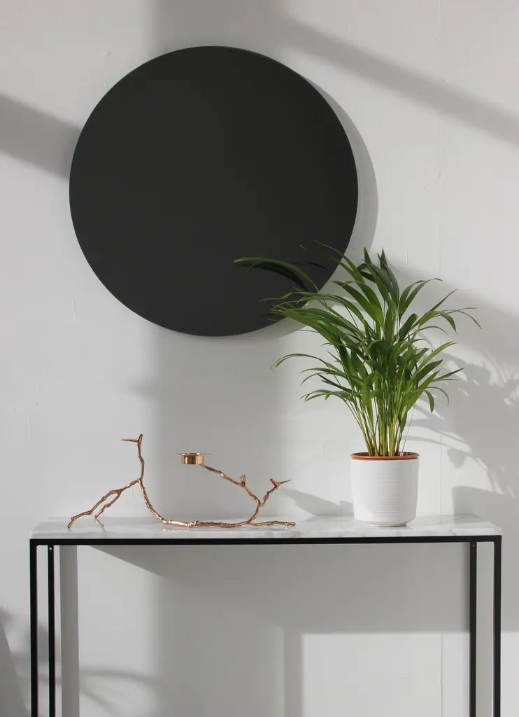 Charming and minimalist round frameless black tinted mirror with a floating effect. Quality design that ensures the mirror sits perfectly parallel to the wall. Designed and made in London, UK.Fitted with professional plates not visible once installed for an easy and safe installation. Lined at the back with a quality protective film. Supplied with all accessories, including screws and wall plugs.This mirror is fully customisable.Shipped safely and insured worldwide. All our mirrors are made on demand. Fabrication lead time for this particular mirror is approximately 3 to 4 weeks. Our mirrors are always shipped by courier express. Shipping via courier express typically requires 1 to 2 days to the UK, or 2 to 7 days outside the UK depending on the destination.Available in the following diameters and variations:Small: 40cm / 15.8"Regular: 50cm / 19.7"Medium: 60cm / 23.6"Large: 80cm / 31.5"Extra Large: 100cm / 39.4"Depth 6mm / 0.24"Prices for 120cm / 47.2”, 150cm / 59”, or any bespoke diameter, are available on demand.Available options:- mirror tints: standard silver, black, bronze, blue, rose gold/peach- back-illumination creating a halo effect- demister pad- bevelPlease contact us for a quote for any bespoke specification or added options.ORDERS OF MULTIPLE MIRRORS OF THE SAME TYPE: Please contact us to receive a Packing and Shipping quote when ordering multiple mirrors of the same type. An order for multiple mirrors of the same type may not be accepted without extra packing and shipping fees. Thank you.
