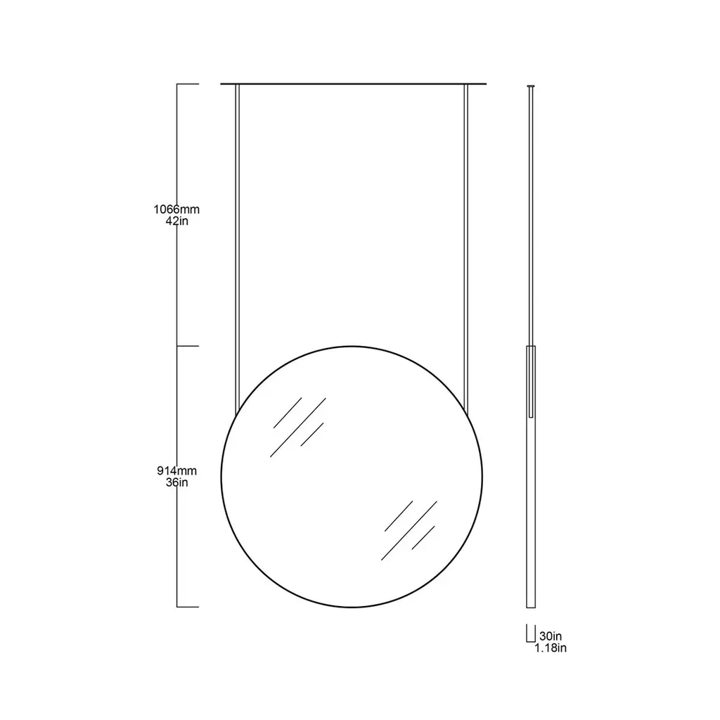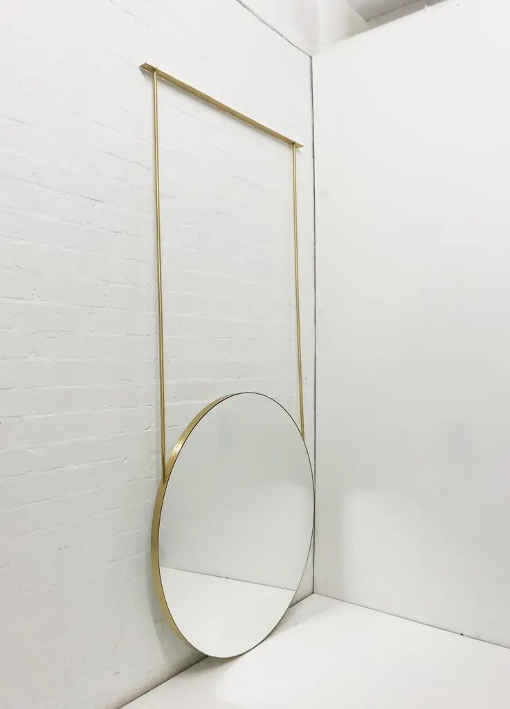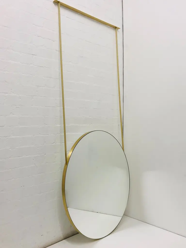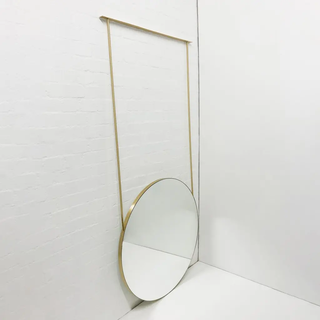 Modern ceiling suspended Orbis™ round mirror with a minimalist solid brushed brass frame and a black panel backing.Our unique collections of ceiling suspended mirrors are designed and handcrafted in London, UK, and are therefore fully customisable to suit the specific requirements of your interior.Dimensions (customisable):914mm (36") diameter x 30mm (1.18") Deep1066mm (42") drop (customisable)The high quality finish of our suspended mirrors extends to their backings, which are made from a powder coated panel available in black or white. Backings can also be upgraded to a finish that matches the frame or can be substituted by a second mirror, making your mirror double sided.The ceiling plate is supplied with a cover hiding the screws to complete the minimalist design of the mirror.Shipped safely and insured worldwide. All our mirrors are made on demand. Fabrication lead time for this mirror is approximately 6 to 7 weeks. Our mirrors are always shipped by courier express. Shipping via courier express typically requires 1 to 2 days to the UK, or 2 to 7 days outside the UK depending on the destination.Available options:•double sided mirror•backing in a finish that matches the frame•frame finishes: brass (brushed, polished or with a bronze patina), copper, stainless steel, blackened metal, powder coated aluminium in a range of standard or bespoke colours•full frame that extends to the front of the mirror•mirror tints: standard silver, black, bronze, blue, rose gold / peach•back-illumination creating a halo effect•front-illumination around the periphery of the mirror•ON/OFF sensor switch•demister pad•bevelA presentation illustrating the options above is also available on demand. Please contact us for a quote for any bespoke specification or added options.IMPORTANT NOTES:-This suspended mirror is intended to be mounted onto the ceiling and cannot be installed onto a countertop. Countertop mounted mirrors are available on demand.ORDERS OF MULTIPLE MIRRORS OF THE SAME TYPE: Please contact us to receive a Packing and Shipping quote when ordering multiple mirrors of the same type. An order for multiple mirrors of the same type may not be accepted without extra packing and shipping fees. Thank you.